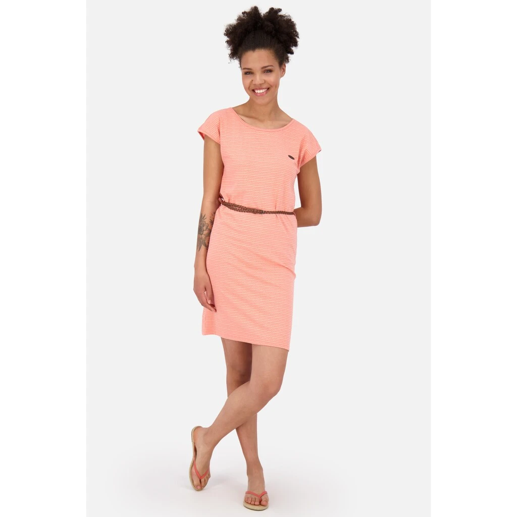 Pure Bequemlichkeit! Das weiche Jerseykleid ElliAK B von Alife and Kickin ist ein toller Hingucker gepaart mit jeder Menge Tragekomfort. Denn egal ob Du zur Shoppingtour durch die Stadt ziehst, bei einer Gartenparty mit Freunden feierst oder am Strand chillst, das kurze Sommerkleid ist immer die perfeke Wahl. Die Zutaten dieses gemusterten Kleides sind schnell erklärt. Kurzarm mit großem Rundhalsausschnitt, angenehm weiches Jerseymaterial und kleine markentypische Labeldetails. Deine goldene Mitte kannst Du mit dem farblich abgehobenen Gürtel in Flechtoptik perfekt akzentuieren. Trotz figurnaher Passform lässt sich das kurzarm Damenkleid vor allem im Sommer wunderbar tragen. Freuen kann sich, wer gerne Sneakers oder Zehensandaletten trägt, denn das Freizeitkleid wird von sportiven Schuhen optimal in Szene gesetzt. ElliAK B von Alife and Kickin, das Kleid für Frauen mit gemütlichem Charakter.