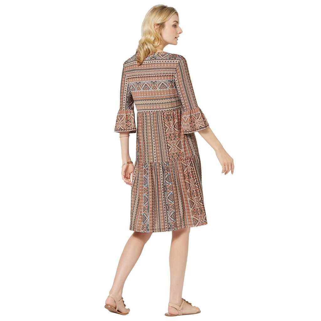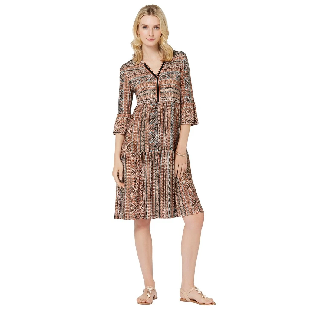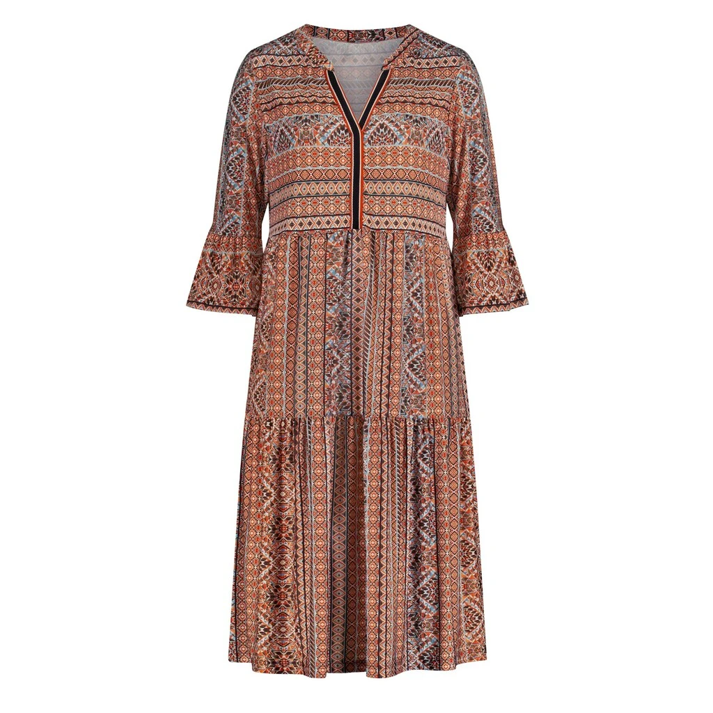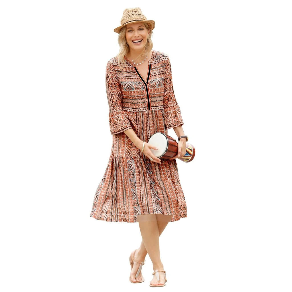Kleid im Tunika-Stil. Die effektvollen Farbkontraste und das optisch streckende Dessin sorgen für den modischen Look. Mit großem V und Zierband – so wird das Dekolleté gekonnt in Szene gesetzt. Mit Volant am Abschluss der 3/4-Ärmel. Dank der Fältchen unterhalb der querverlaufenden Naht im Rock schwingt es wunderbar weit. 95% Polyester, 5% Elasthan. Maschinenwäsche.