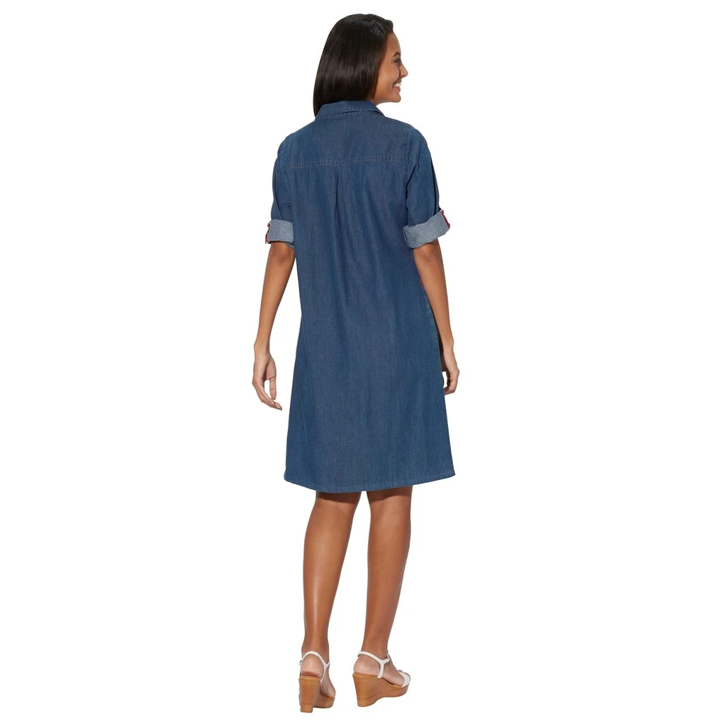 Cooles Jeans-Kleid mit Hemdkragen und kleinem V. Die Kellerfalte hinten gibt viel Bewegungsfreiheit. 2 Taschen. Rotes Ripsband an den Ärmeln mit denen diese auf 3/4-Länge gekrempelt werden können. Wiener Nähte für einen optimalen Sitz. 100% Baumwolle. Maschinenwäsche.