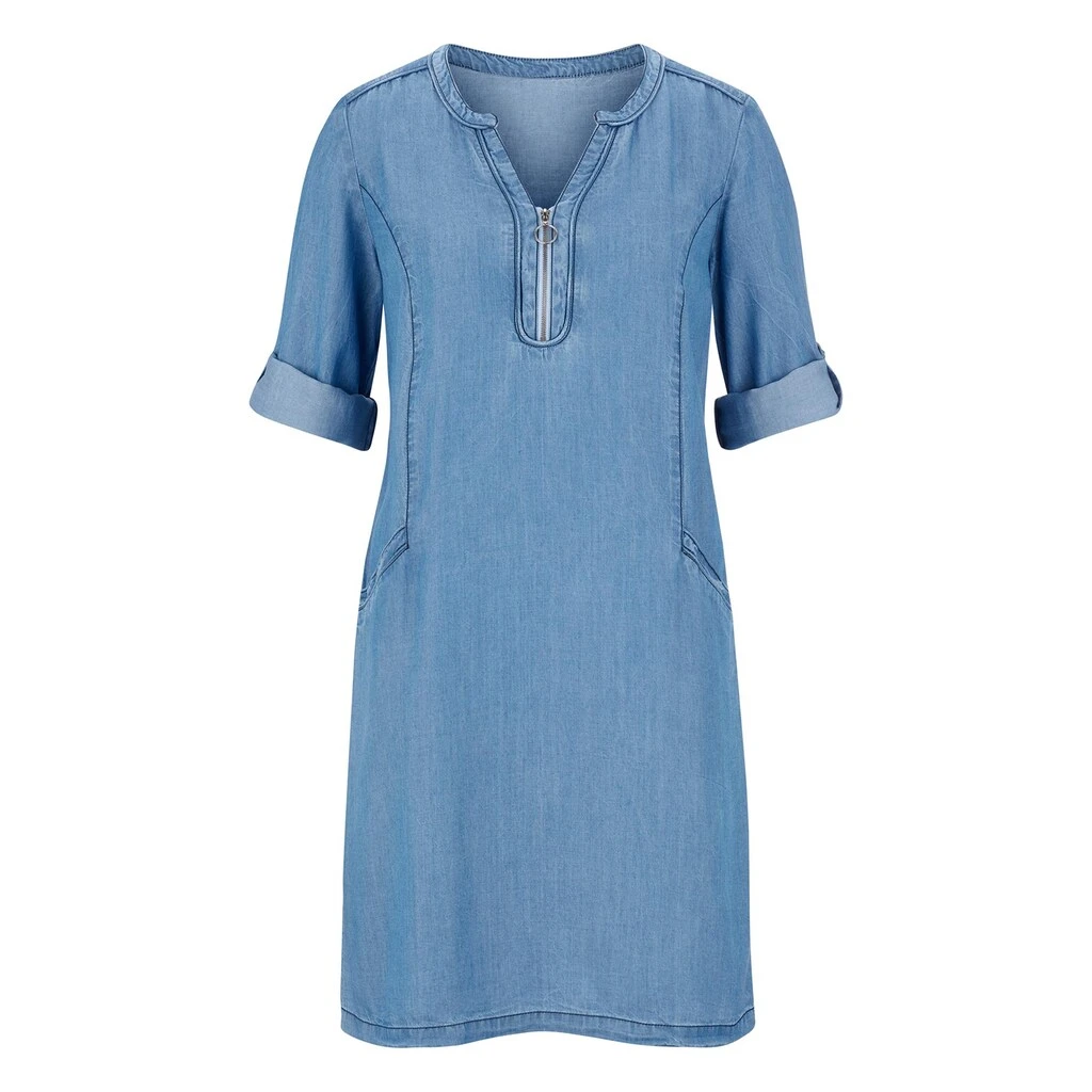 Perfekt für den Sommer! Weich fließendes Kleid in atmungsaktiver Tencel-Qualität. Schön gestalteter Ausschnitt mit kurzem Reißverschluss, 2 paspelierte Taschen mit Kontrastnaht, 3/4-lange Ärmel mit Riegel zur individuellen Längenregulierung. 100% Lyocell (TENCEL). Maschinenwäsche.