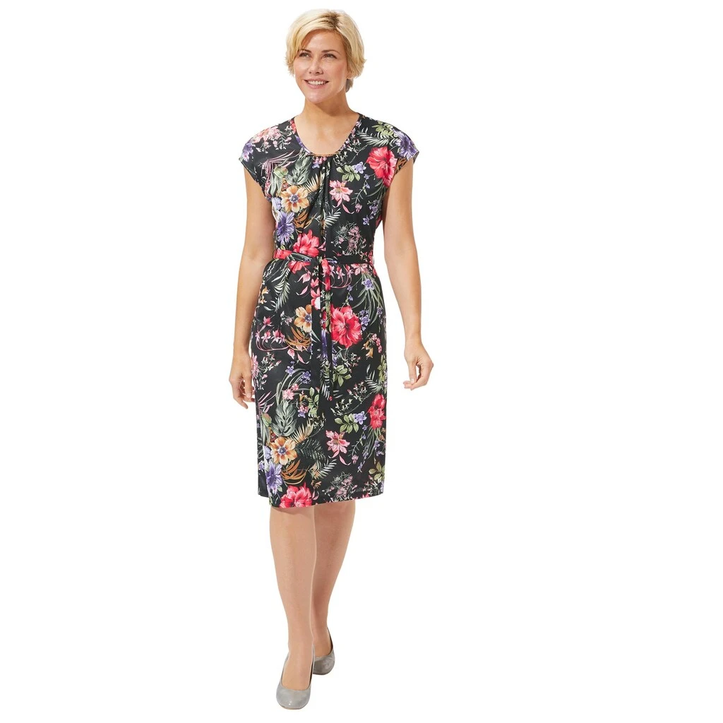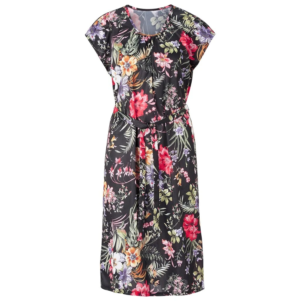 Ideal an heißen Tagen: Jersey-Kleid in luftiger, gerader Schlupfform mit überschnittenen Schultern und floralem Dessin. Raffung am Ausschnitt und Bindegürtel. Länge ca. 110 cm. 100% Polyester. Maschinenwäsche.