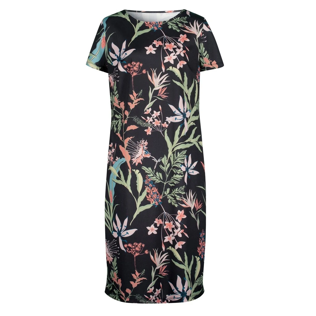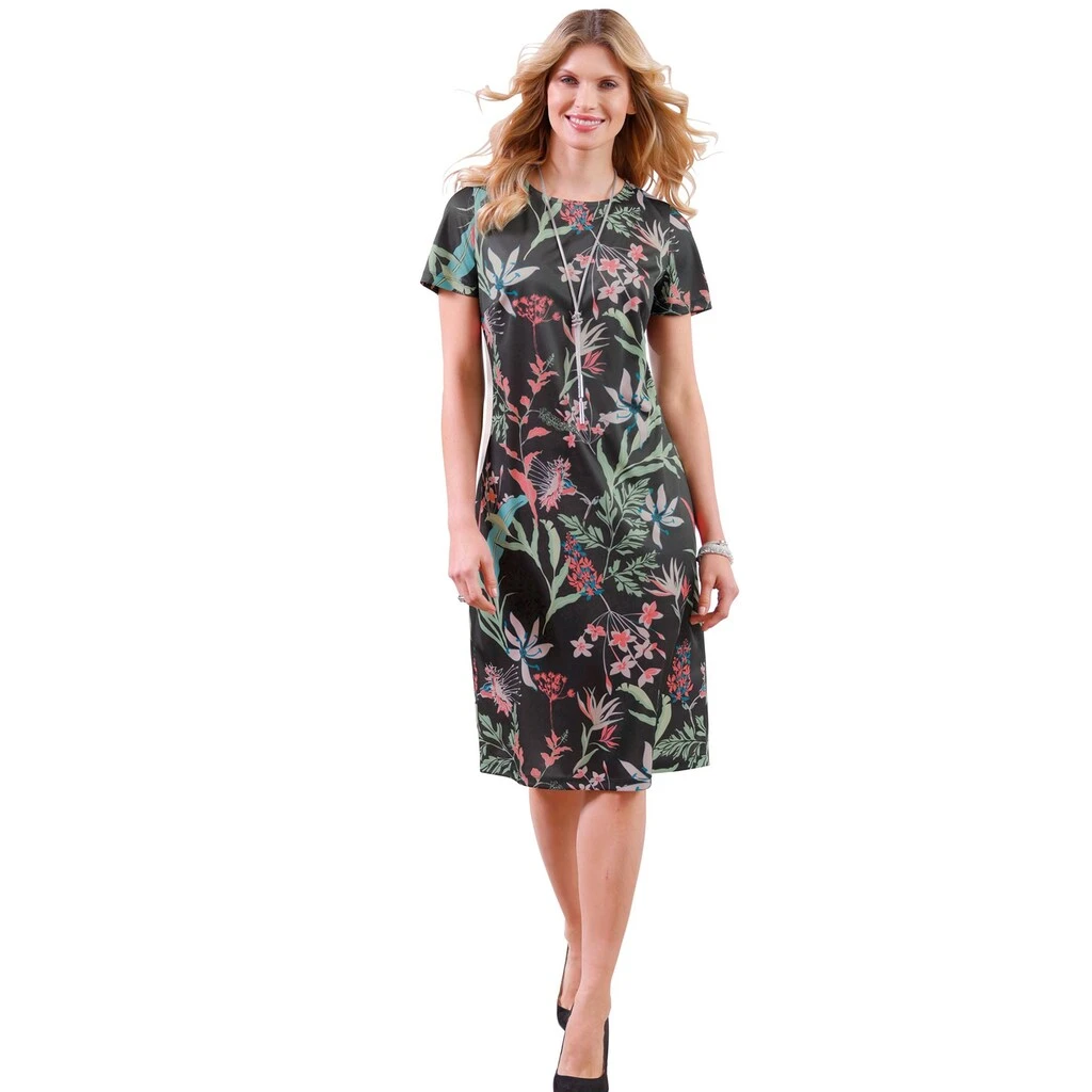 Formstabil, bequem und im ausdrucksstarken, floralen Dessin – dieses Jersey-Kleid weiß rundum zu überzeugen! Mit Rundhals-Ausschnitt und kurzen Ärmeln. 100% Polyester. Maschinenwäsche.
