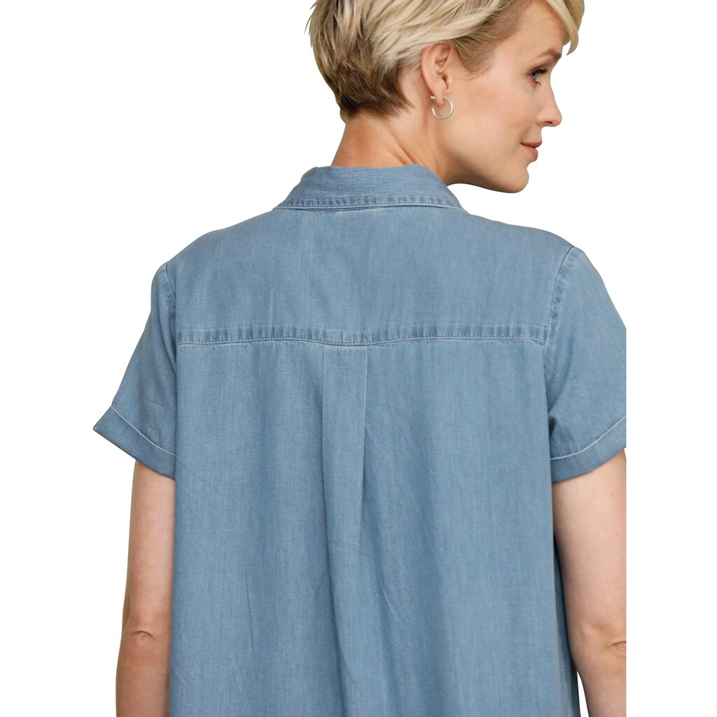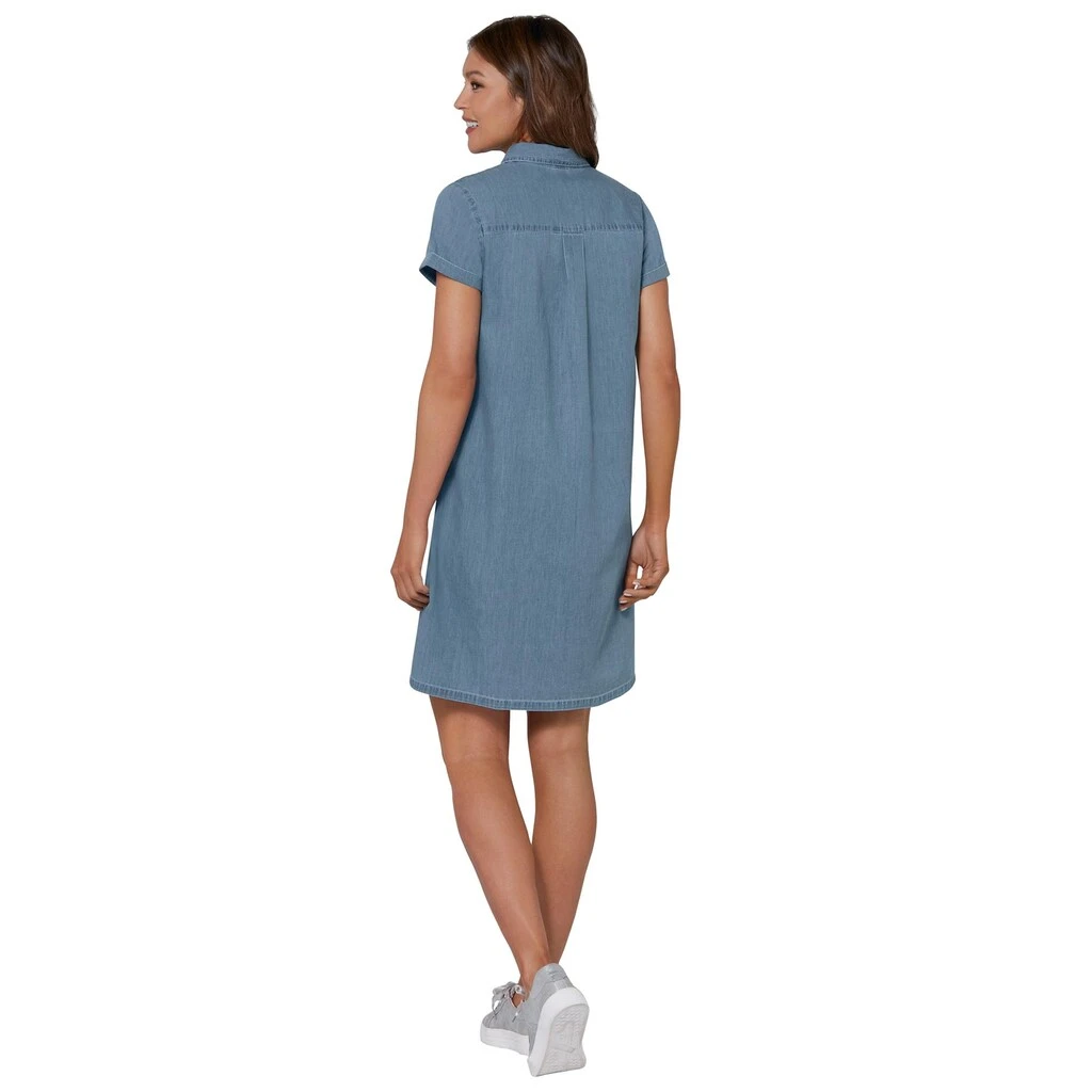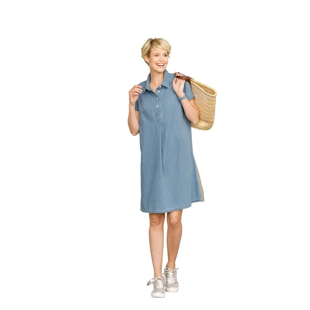 Lässig-sportiver Chic zum Reinschlüpfen und gut Aussehen: Jeans-Kleid in Schlupfform mit Hemdkragen und kurzer Knopfleiste mit schimmernden Knöpfen. Die aufspringende Falte vorne sowie an der Rückenpasse gibt ihm die schmeichelnde Weite, die kleine Pölsterchen geschickt kaschiert. Brustabnäher. Fixierter Aufschlag an den kurzen Ärmeln. In hautsympathischer Qualität. 100% Baumwolle. Maschinenwäsche.