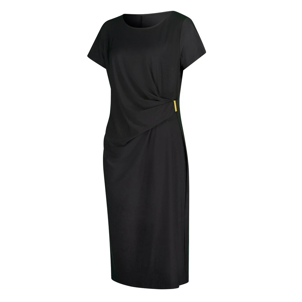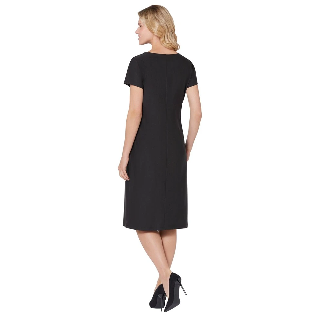 Ein Kompliment in jeder Konfektionsgröße ist dieses elegante Kleid mit schmeichelnder Raffung und glänzender Zierschnalle im Vorderteil. 95% Polyester, 5% Elasthan. Maschinenwäsche.