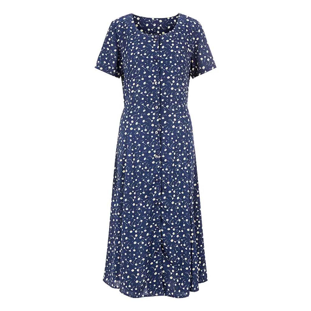 Luftig leichtes Kleid für warme Sommertage. Rundum im süßen Blümchen-Muster. Vorne mit durchgehender Knopfleiste. Im Rücken mit schmalen Bindebändern, durch die Sie die Taillenweite selbst regulieren können. Mit Passform-Nähten. Herrlich pflegeleicht, denn die Stoffqualität ist bügelarm! 100% Polyester. Maschinenwäsche.
