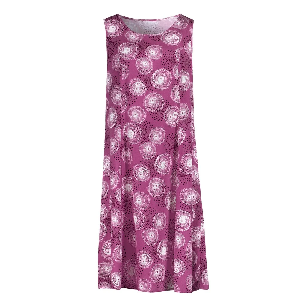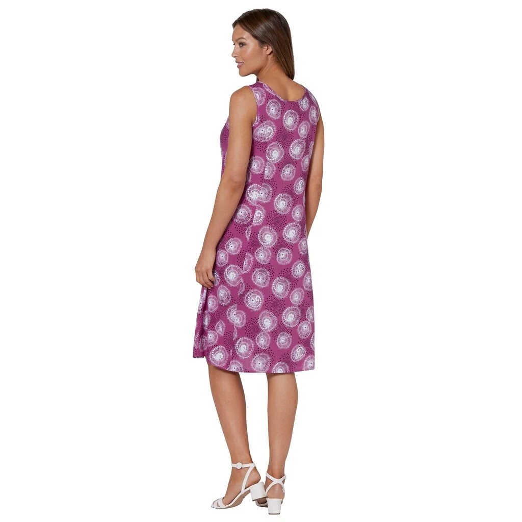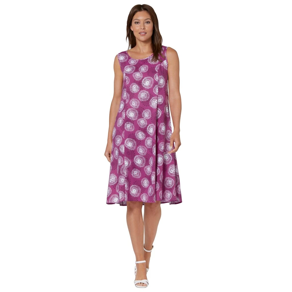Bestimmt bald Ihr Favorit! Denn das ärmellose Kleid in schwingender Bahnenform und attraktivem Druck ist sommerlich leicht und durch die A-Linie auch noch wunderbar figurschmeichelnd. Wiener Nähte sorgen für den optimalen Sitz. 100% Viskose. Maschinenwäsche.