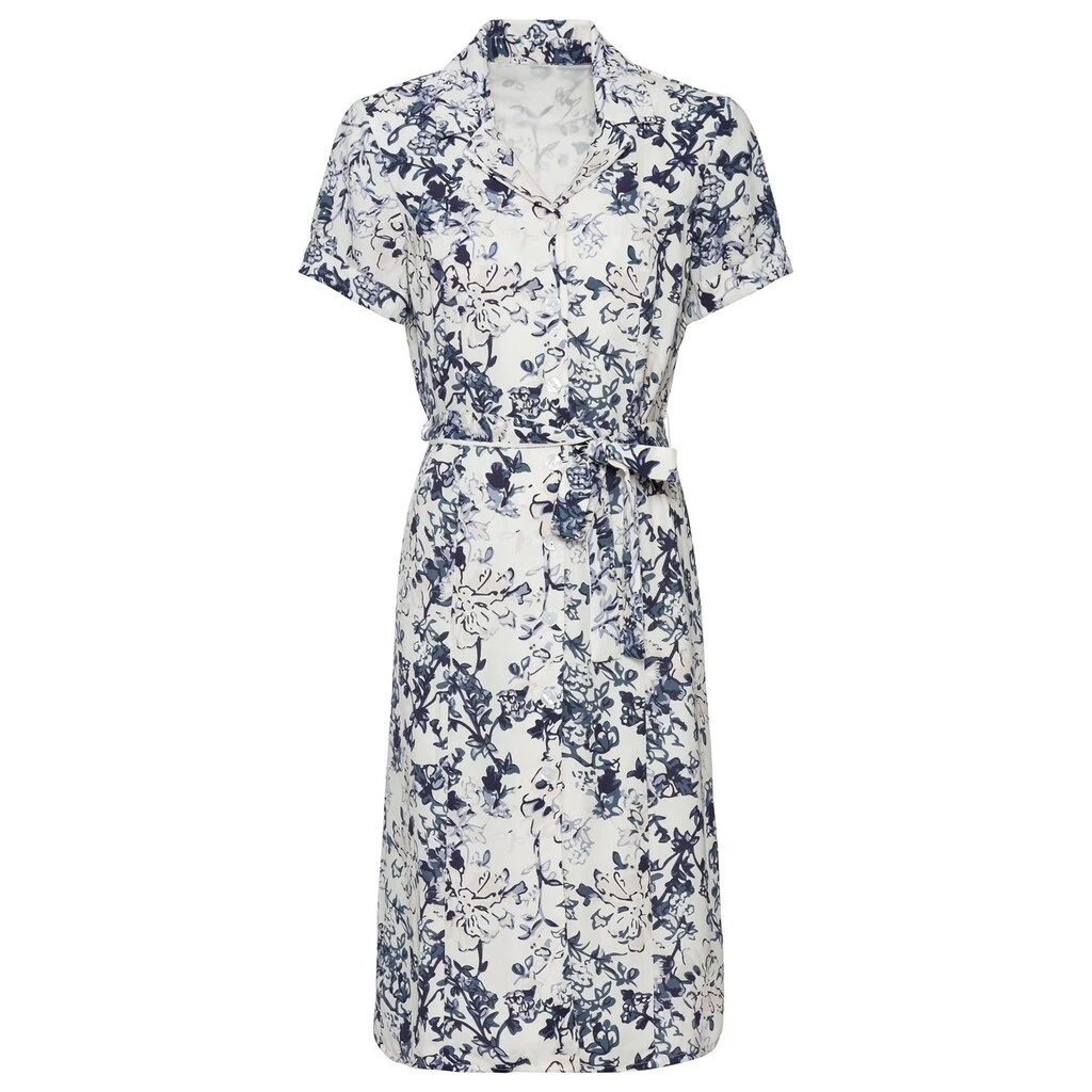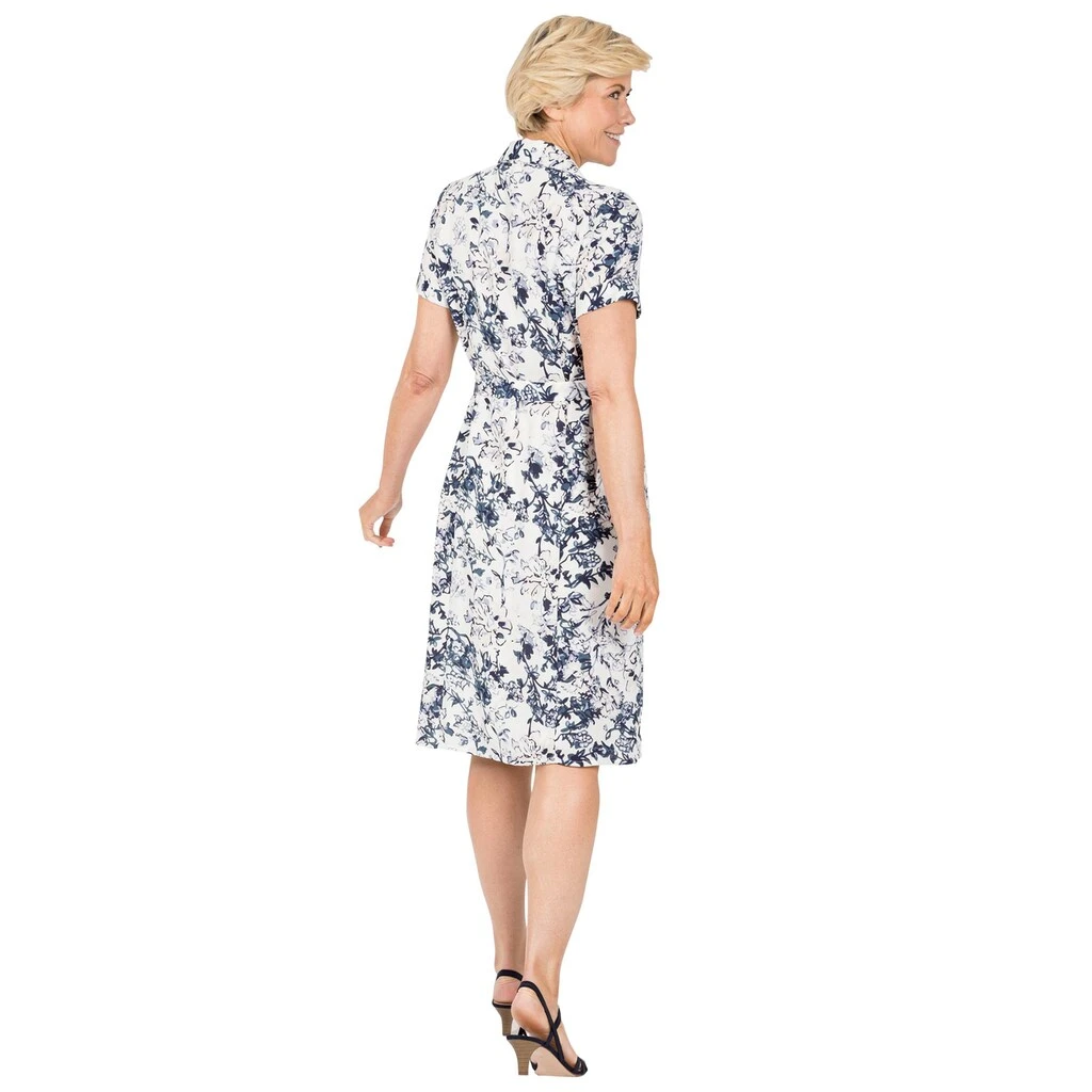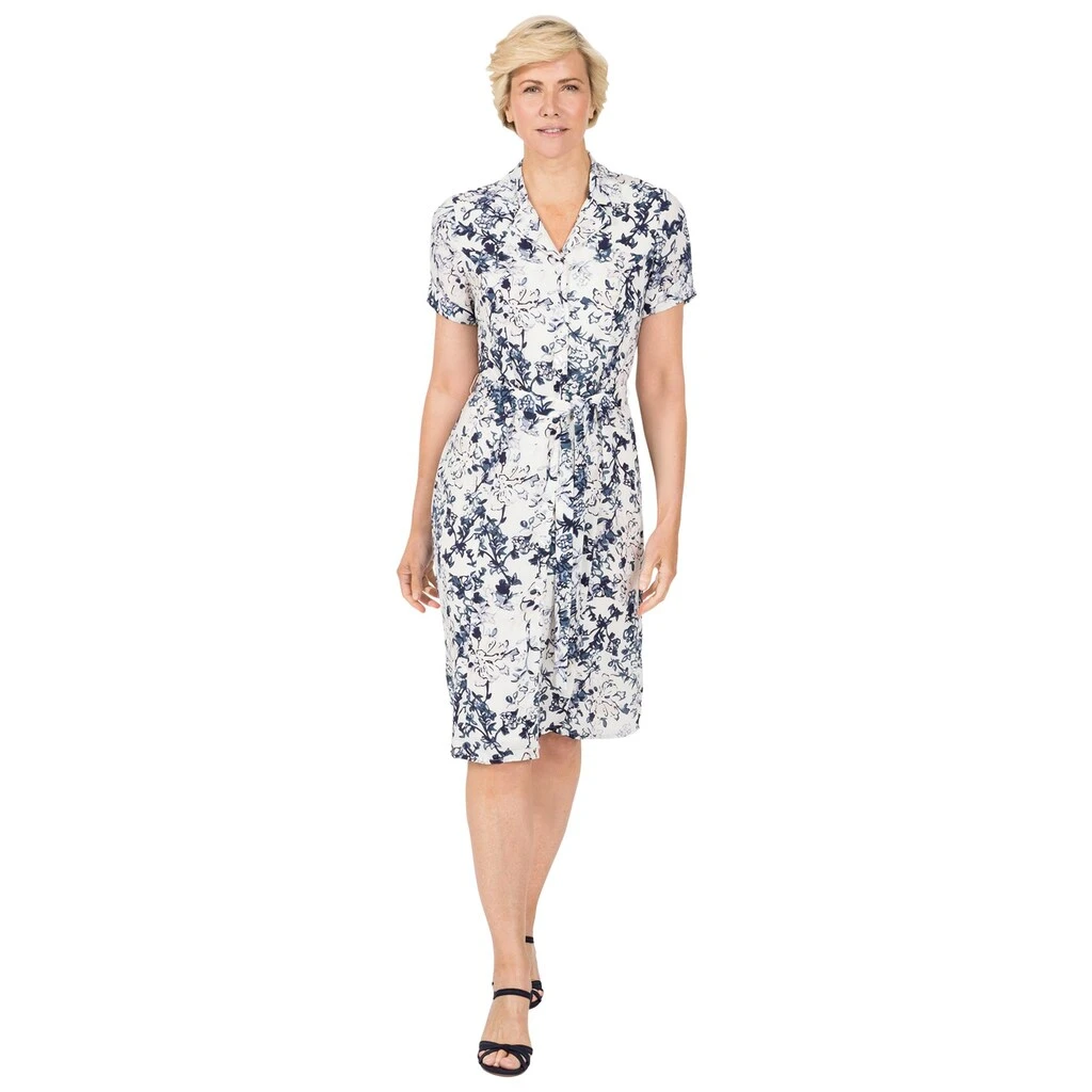 Ein Blütenmeer in frischer Farbgebung präsentiert sich auf diesem femininen Kleid! Der klassische Schnitt mit Reverskragen, kurzen Ärmeln mit imitiertem Umschlag und durchgehender Knopfleiste macht eine gute Figur! Bindegürtel mit Gürtelschlaufen. 100% Polyester. Futter: 100% Polyester. Maschinenwäsche.