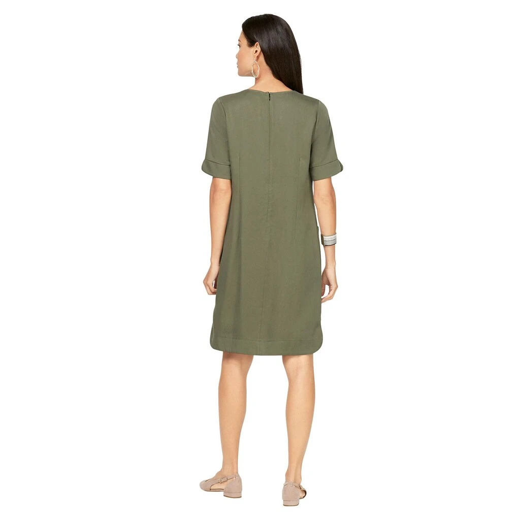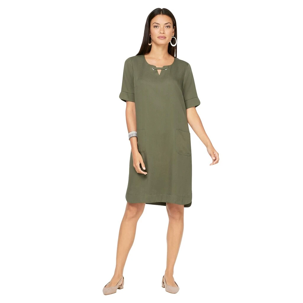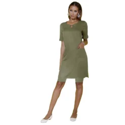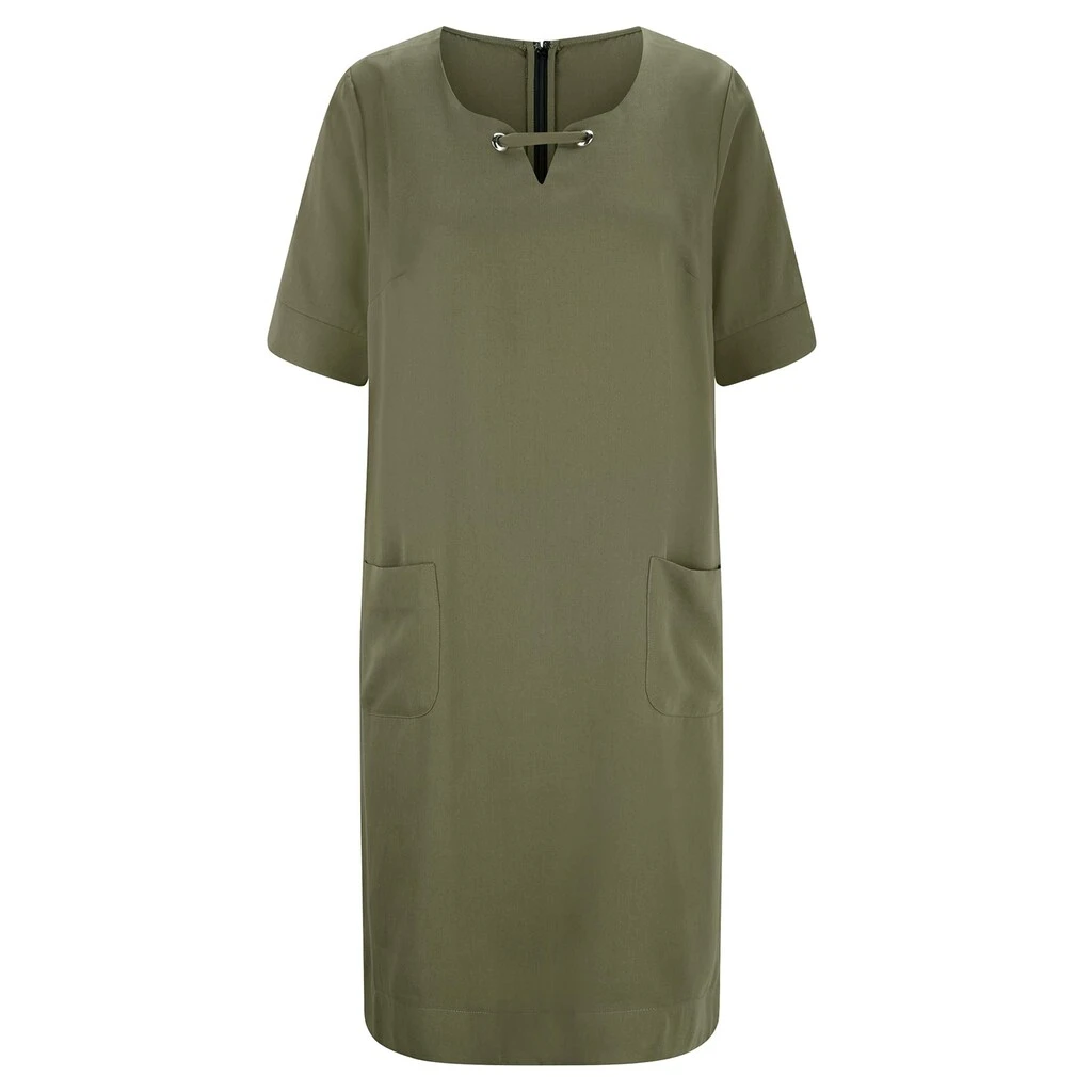 Absolut bequemes Kleid aus hochwertigem, formstabilem Jersey. V-förmiger Aussparung, Ösen und Zierband am Rundhals-Ausschnitt. Hüftlanger Reißverschluss hinten. Kaschierend längere, kurze Ärmel mit Blende und Schlitz. 2 aufgesetzte, praktische Taschen. Abgerundete Seitenschlitze. 77% Viskose, 23% Lyocell. Maschinenwäsche.