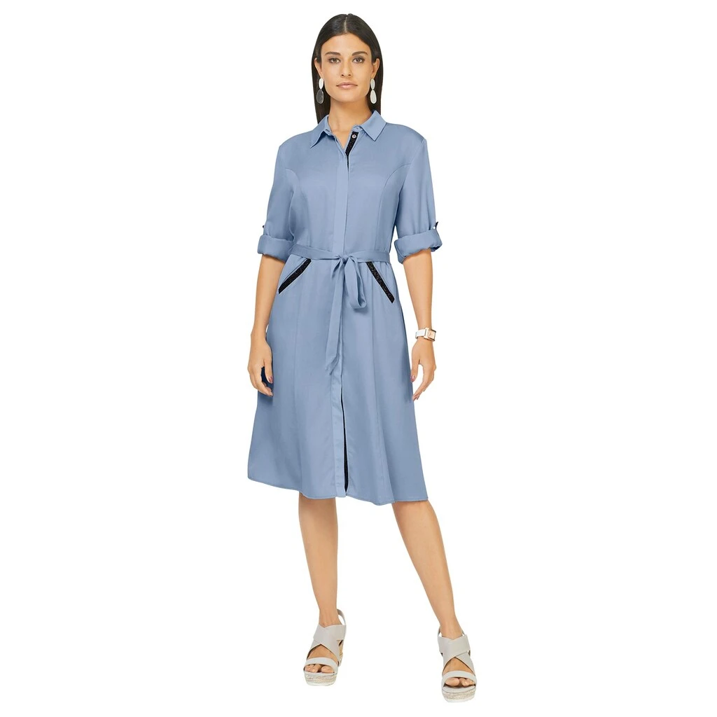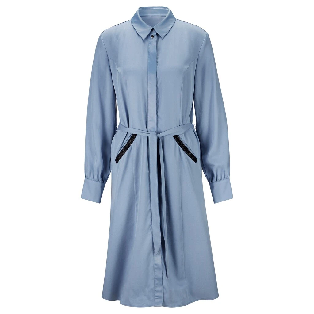 Das elegant-sportive Kleid im Hemdblusenstyle und leichter A-Form punktet mit Bindegürtel, durchgehender, verdeckter Druckknopfleiste, formenden Wiener Nähten und Rückenpasse mit Weite gebender Falte. Der Kragen und die Blende vorne sind aus mattem Satin, die Blenden an den beiden Taschen und unterhalb der Druckknopfleiste mit glänzendem Kontrastband verziert. Lange Ärmel mit Knopfmanschetten, variabel auf 3/4-Länge oder als Halbarm mit Riegel und Knopf zu fixieren. Toller Tragegenuss durch den edlen, weich fließenden Stoff. 100% Lyocell. Maschinenwäsche.