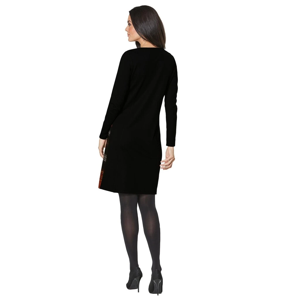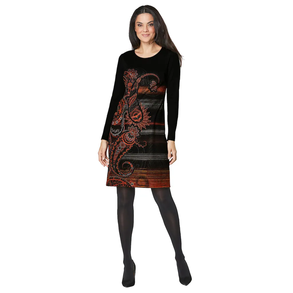 Punta di Roma-Kleid: Auf der hochwertigen Qualität kommt das extravagante Dessin mit Paisleys und verschieden breiten Streifen besonders gut zur Geltung! Angenehm weich und gleichzeitig formstabil. Das Rückenteil und die langen Ärmel sind Uni schwarz. Rundhals-Ausschnitt, Brustabnäher, Teilungsnähte hinten. 60% Viskose, 37% Polyamid, 3% Elasthan. Vorderteil: 75% Polyester, 25% Viskose. Maschinenwäsche.