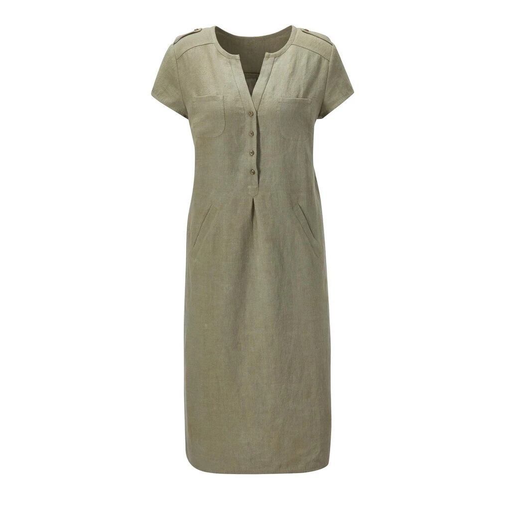 Einfach perfekt an warmen Sommertagen: Leinenkleid in super trageangenehmer, kühlender Qualität. Rundhals-Ausschnitt mit offenem V und Knopfleiste bis zur Taille. Zierriegel auf der Schulter. Die eingelegten Kellerfalten sorgen für die schmeichelnde Weite. 2 aufgesetzte Brusttaschen, 2 seitliche Taschen. Mit weißem Baumwoll-Futter. 100% Leinen. Futter in der Farbe Weiß: 100% Baumwolle. Maschinenwäsche.