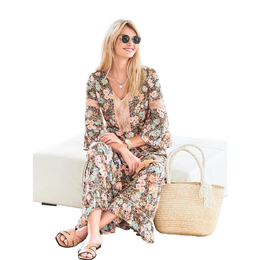 Druck-Kleid Sommertraum in floralem Dessin aus luftig-leichter Viskose. Mit Volants an 3/4-Trompetenärmeln und Saumabschluss, V-Ausschnitt und halber Zierknopfleiste. Tunnelzug mit Bindeband und Quasten in der Taille für eine perfekte Passform. 100% Viskose. Unterkleid: 100% Baumwolle. Maschinenwäsche.