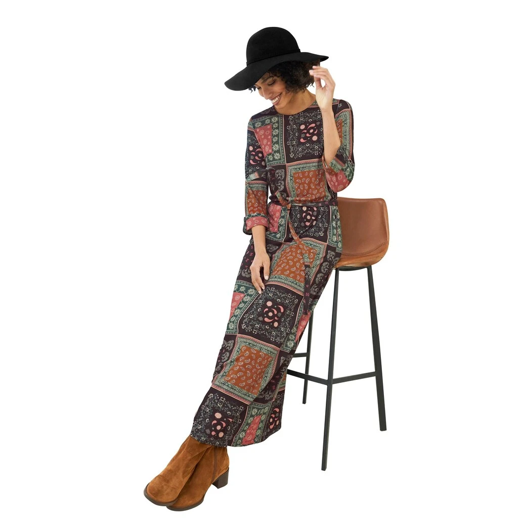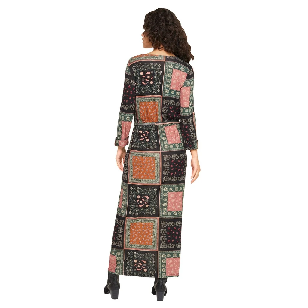 Jersey-Kleid Im Mustermix mit modischem Patch-Druck. Geraffter Gummibund auf Taillenhöhe sorgt für eine tolle Figur. Gürtelschleifen und Bindegürtel mit Zierriegel und Knopf. 3/4 Arm mit fixiertem Umschlag und Knopfverschluss. 100% Viskose. Maschinenwäsche.