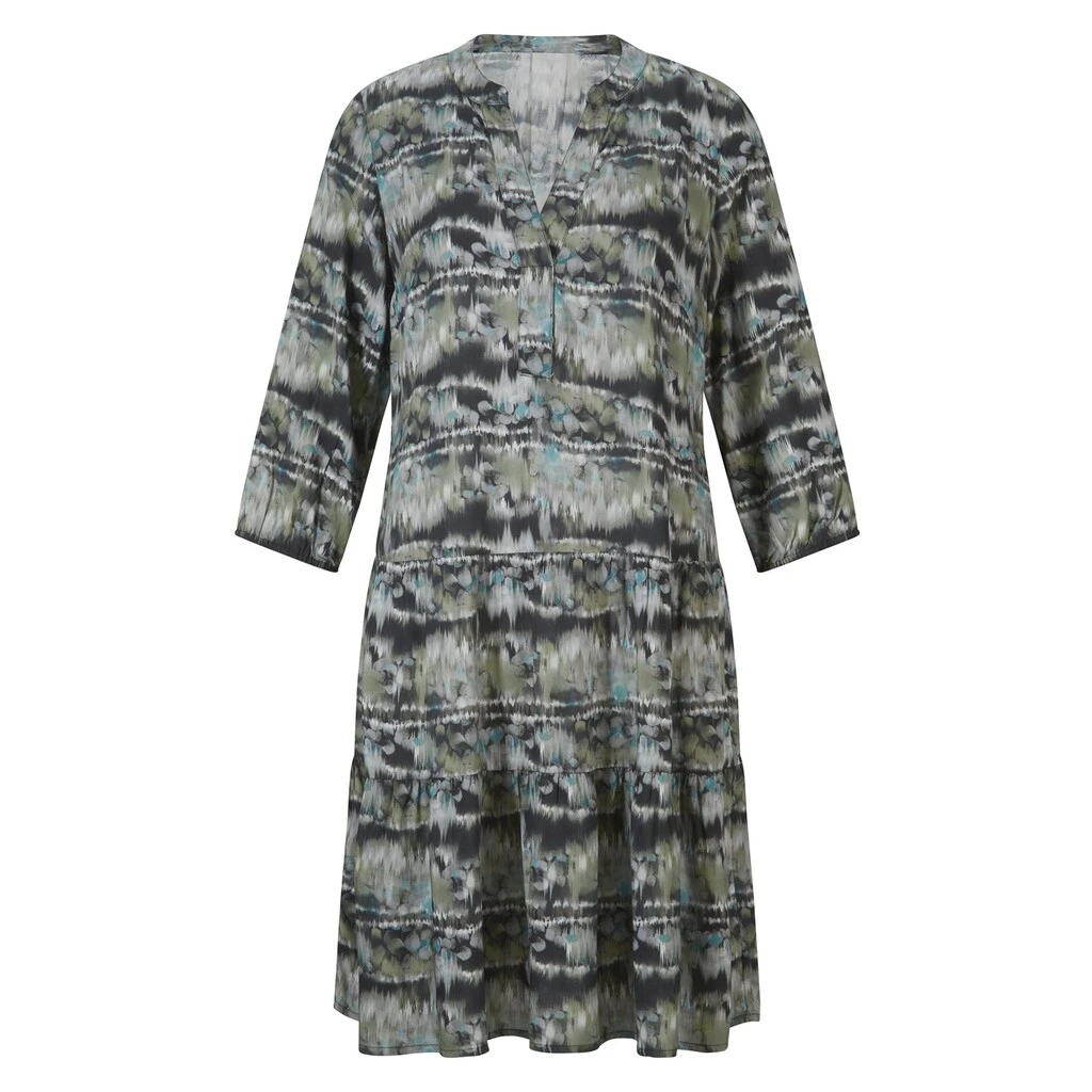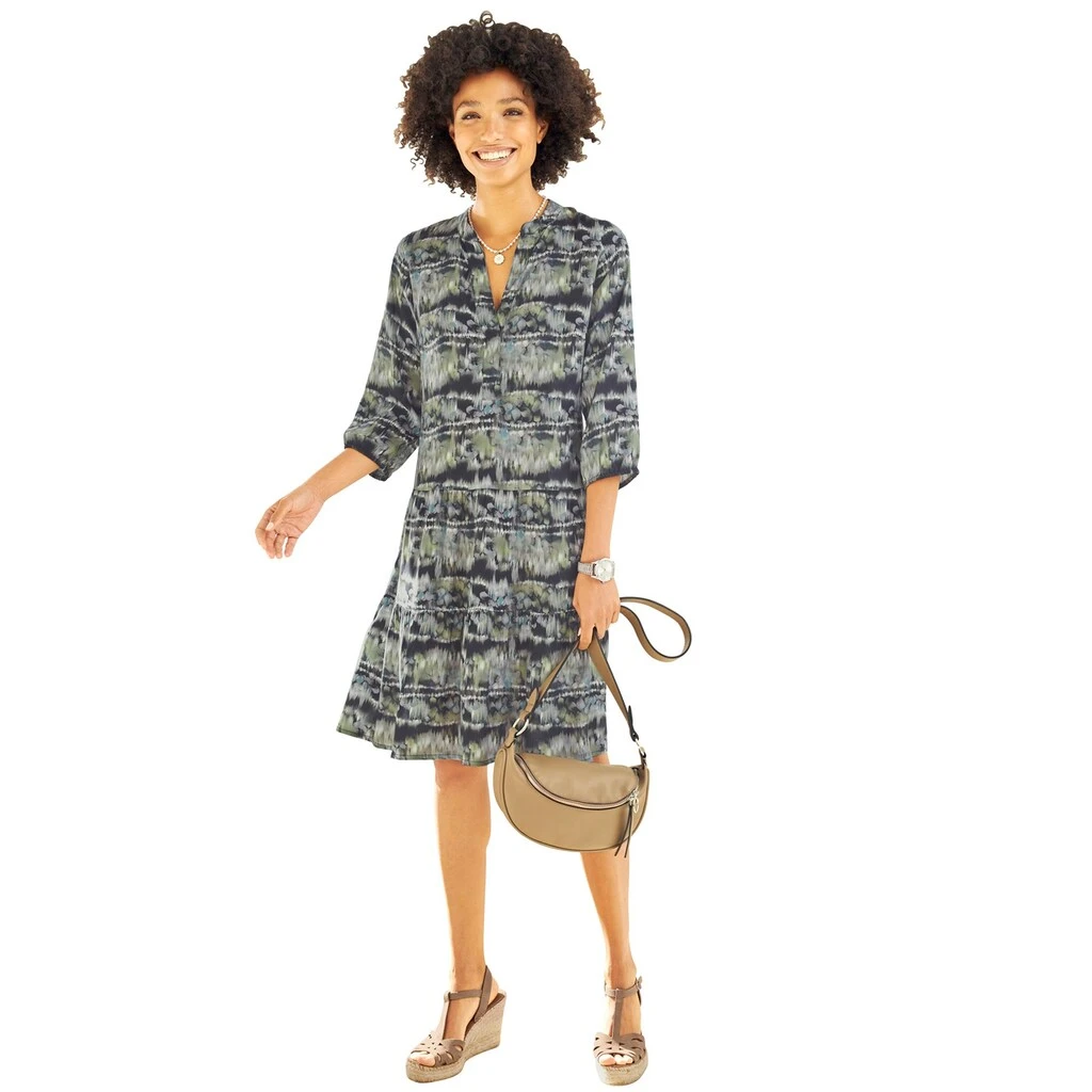Druck-Kleid Wir beeindrucken alle in effektvoller Batik-Optik und angesagter Schlupfform. Rundhals mit offenem V. Leichte A-Form. 3/4 Arm. Ärmelabschluss mit Gummibündchen. 100% Viskose (EcoVero). Maschinenwäsche.
