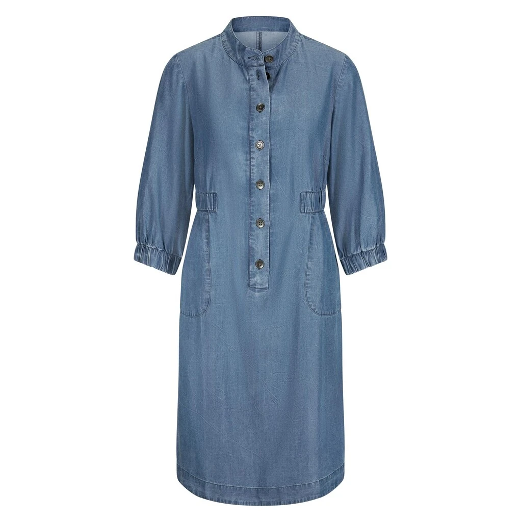 Kleid Herrlich leichte Lyocell-Qualität in trendiger Jeans-Optik. Mit Stehkragen und hüftlanger Knopfleiste. Aufgesetzte Eingrifftaschen. Geraffter Gummibund im Taillenbereich. 3/4-Ärmel mit Gummibündchen. 100% Lyocell. Maschinenwäsche.