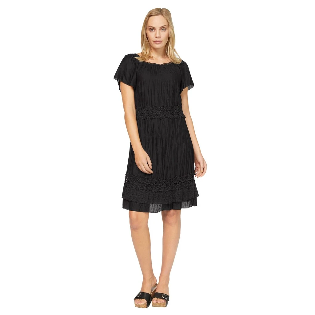 Kleid Attraktiver Eyecatcher mit edlen Details aus echter Madeira-Spitze! Verschlusslos, mit Kurzarm und Volant-Abschluss. Rundhalsausschnitt mit feinem Crochet-Band. Weiche, trageangenehme Qualität in moderner Crash-Optik. 100% Modal. Futter: 100% Viskose. Maschinenwäsche.