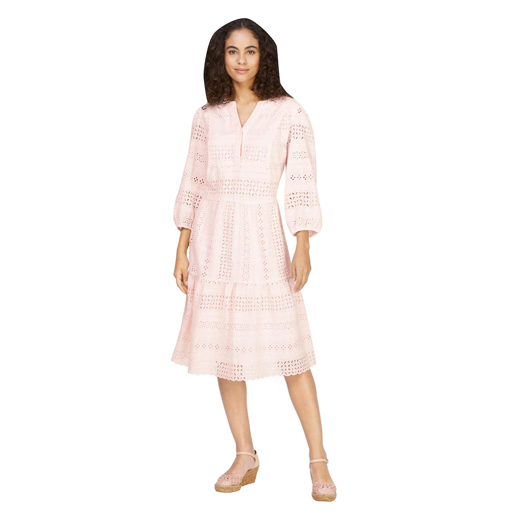 Kleid Ein echter Figurschmeichler! Mit zauberhafter Lochspitze, gekräuselten Teilungsnähten und verspielten 3/4-Puffärmeln mit Gummizug. Runder Ausschnitt mit V und verdecktem Knopf. Leicht ausgestellter Rock. 100% Baumwolle. Futter: 100% Baumwolle. Maschinenwäsche.
