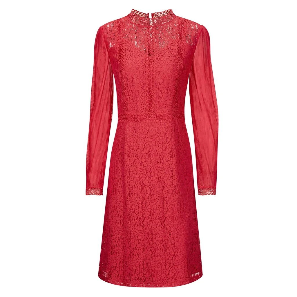 Kleid Edler Style mit ausdrucksstarke Spitze. Blickdicht unterlegt. Modischer Stehkragen und leicht transparente Ärmel in Plissee-Qualität. Nahtfeiner Reißverschluss und Knopf hinten. 65% Baumwolle, 35% Polyamid. Futter: 100% Polyester. Ärmel: 100% Polyester. Maschinenwäsche.