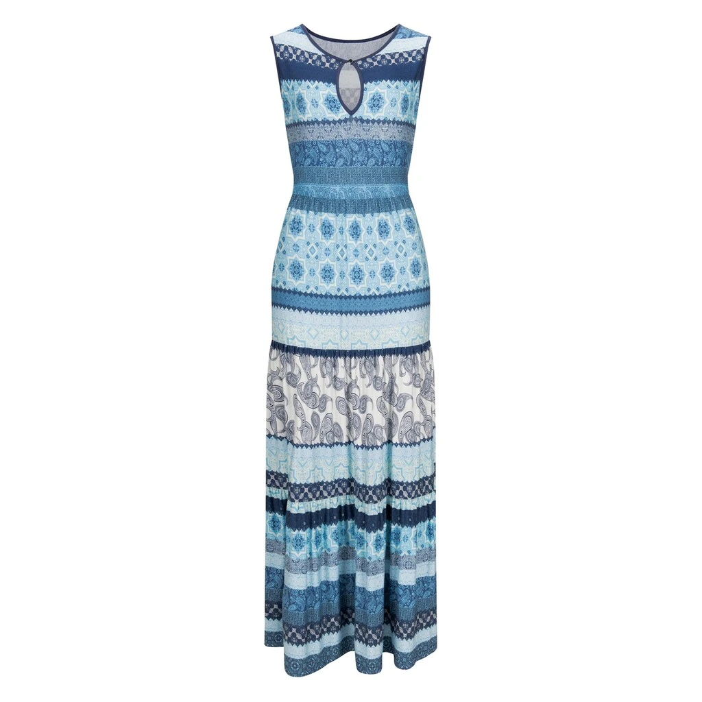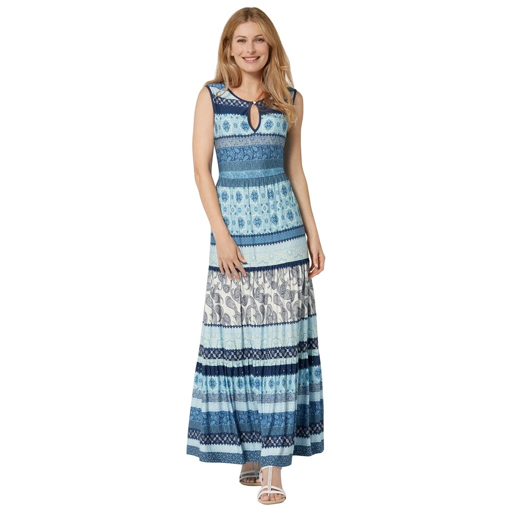 Das ärmellose Jersey-Kleid im auffallend schönen Muster-Mix ist ebenso attraktiv wie bequem. Der Knopfverschluss mit Schlitz am Rundhals-Ausschnitt erleichtert das An- und Ausziehen. Unten sorgen Stufen mit Raffungen für die schwingende Weite. Jedes Teil ein Unikat! 95% Viskose, 5% Elasthan. Maschinenwäsche.