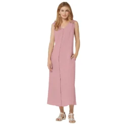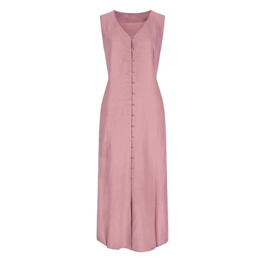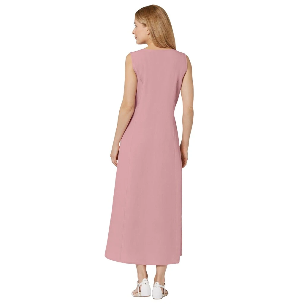 Sommerliches Kleid in trageangenehmer, hochwertiger Lyocell-Leinen-Qualität. Schmeichelnde A-Form mit optisch streckendem V-Ausschnitt und formgebenden Wiener Nähten. Der Gehschlitz vorne kann dank der durchgehenden Knopfleiste mit Schlingenverschlüssen mal mehr und mal weniger Bein zeigen. Besonders praktisch: die versteckten Taschen in der Seitennaht. 70% Lyocell, 30% Leinen. Maschinenwäsche.