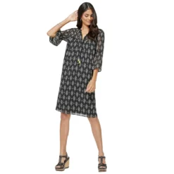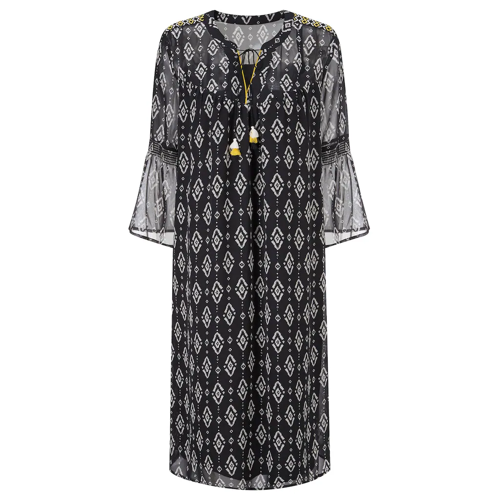 Das Kleid hat alles, was ein Lieblingskleid braucht: duftige Chiffon-Qualität, edler Ethno-Druck und vorteilhafter Figurschmeichelschnitt – ein absolutes Must-have! Rundhals-Ausschnitt mit Kontrastpaspel am kleinen, überlappenden V und Kordelbänder mit 3-farbigen Quasten zum individuellen Binden. Die aufgesetzte Stickereibordüre entlang der Schulternaht und die 3/4-Ärmel mit Smokpartie und Volants am Abschluss sind das i-Tüpfelchen. Ab der gerundeten Brust- und Rückenpasse mit Faltenpartie ist das Kleid blickdicht gefüttert, an den Schultern und Ärmeln schimmert die Haut verführerisch durch. 100% Polyester. Futter: 100% Polyester. Maschinenwäsche.