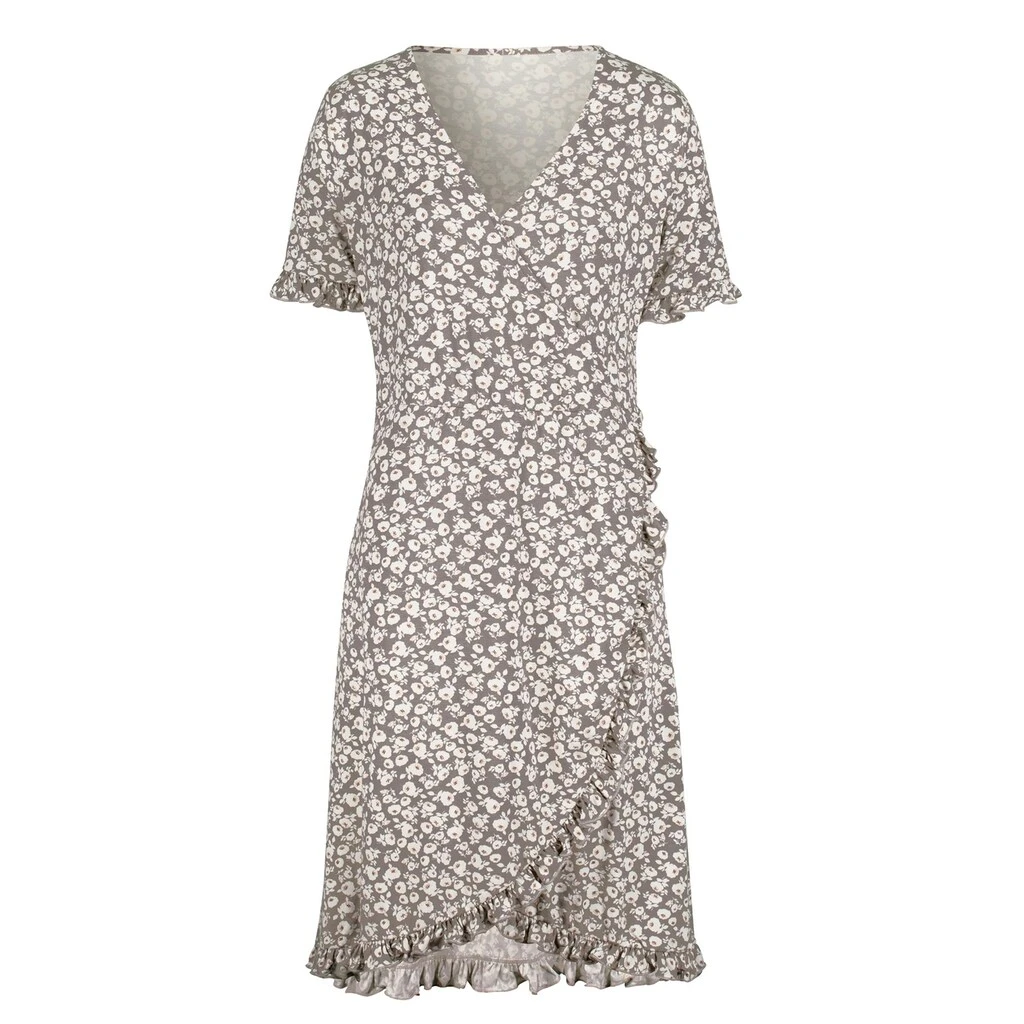 Wunderschönes Jersey-Kleid in geschmeidig fließender Qualität und hübschem Blümchendruck. Die schmeichelnde Wickel-Optik entsteht dank des überlappenden V-Ausschnitts und des überlappenden, abgerundeten Rockteils. Ein verspieltes Detail sind die kleinen Rüschen am Abschluss der kurzen Ärmel und am Saum. Formgebende Taillennaht. 95% Viskose, 5% Elasthan. Maschinenwäsche.
