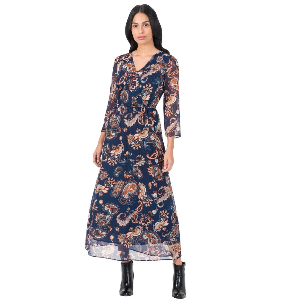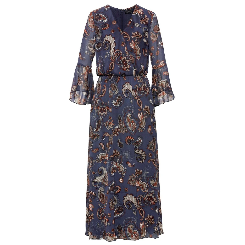 Wunderschönes, langes Kleid in effektvoll bedruckter, fließender Chiffon-Qualität. Der V-Ausschnitt und die fixierte Wickel-Optik strecken optisch. Der elastische Einsatz an der Taille und der schwingende Rock sorgen dafür, dass kleine Pölsterchen geschickt kaschiert werden. Leicht transparente 7/8-Ärmel. 100% Polyester. Futter: 100% Baumwolle. Maschinenwäsche.