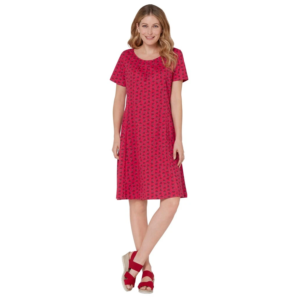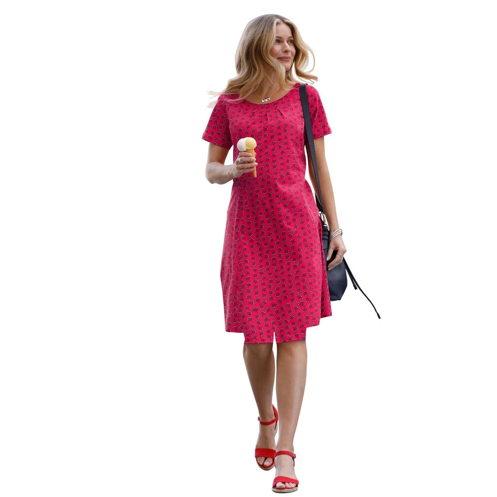 Wohlfühl-Begleiter mit Kompliment-Garantie: Druck-Kleid im floralen Dessin auf formstabiler, glatter Jersey-Qualität aus hautsympathischer Pima-Baumwolle. Für die schmeichelnde Silhouette sorgen die nach unten aufspringenden Falten am Rundhals-Ausschnitt, die formgebenden Teilungsnähte und die ausgestellte Form. 100% Baumwolle. Maschinenwäsche.