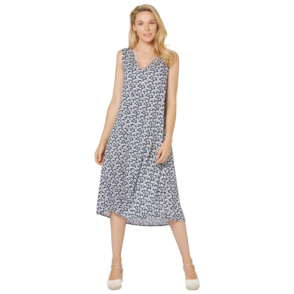 Schwungvoll durch den Sommer bringt Sie dieses Druck-Kleid in schmeichelnd ausgestellter, schwingender Form. Schlupfform mit optisch streckendem V-Ausschnitt, angenehm breiten Trägern und trendig abgerundetem Saum. Fließende Web-Qualität im Blümchen-Dessin. 100% Viskose. Maschinenwäsche.