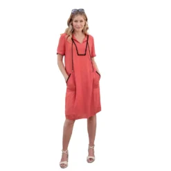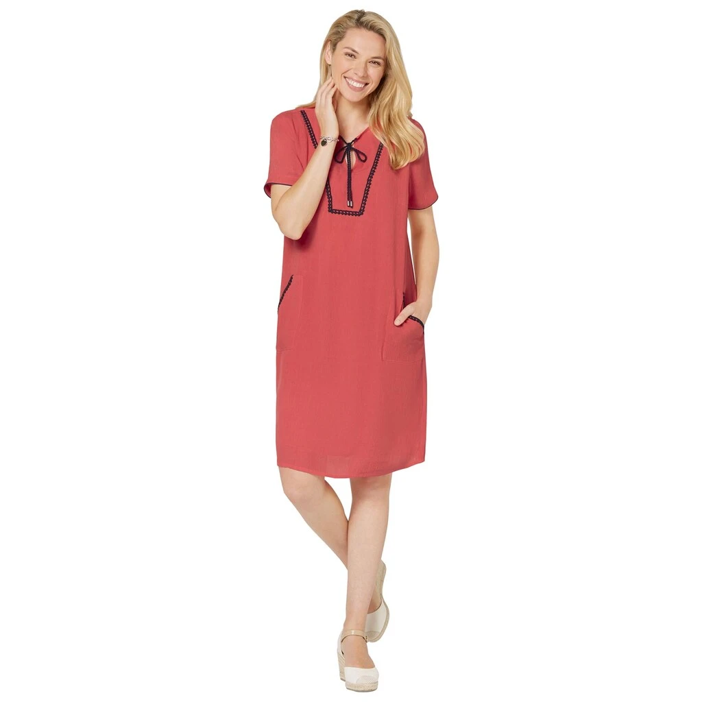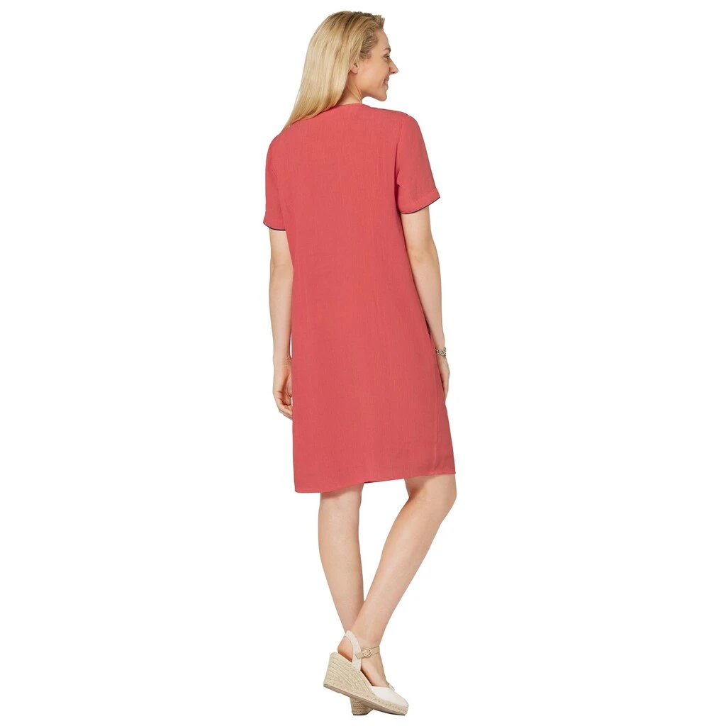 Lässig-weit! Modisch! Wunderbar! Kontrastfarbige Akzente setzen bei diesem Tunika-Kleid die Stickerei im Vorderteil und an den beiden aufgesetzten Taschen, die fixierte Kordel am Rundhals-Ausschnitt mit kleinem V sowie die Paspel an den halblangen Ärmeln. In ebenso weicher, wie pflegeleichter Qualität in Crinkle-Optik. Vorder- und Rückteil blickdicht gefüttert. 100% Viskose. Futter: 100% Baumwolle. Maschinenwäsche.