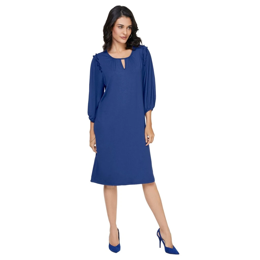Setzen Sie ein modisches Statement mit diesem attraktiven Jersey-Kleid! Interessant gestalteter Ausschnitt mit V-förmiger Aussparung und Bändchenverzierung mit silberfarbener Zierperle. Leicht gerafft für etwas mehr Weite. Die weiten 3/4-langen Ärmel sind im Schulterbereich mit geschickt platzierten Falten versehen. Abschlüsse mit Gummizug. Die leichte A-Linie fällt schön locker und kaschiert perfekt! 95% Viskose, 5% Elasthan. Maschinenwäsche.