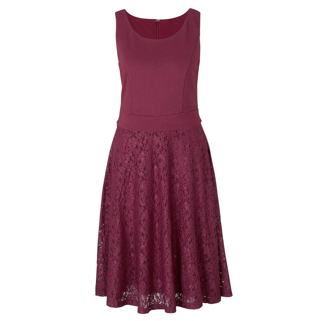 Reizvoller Begleiter für festliche Anlässe: ärmelloses Jersey-Kleid mit wunderbar femininer Silhouette! Eine breite Blende betont die Taillenpartie, die in ein weites Rockteil aus Spitze übergeht. Hinten mit verdecktem Haken- und Reißverschluss. Figurformende Wiener Nähte. Die schwere Jersey-Qualität ist absolut pflegeleicht und knittert nicht. Mit elastischem Futter. 75% Viskose, 20% Polyamid, 5% Elasthan. Spitze: 100% Polyamid. Futter: 100% Polyester. Maschinenwäsche.
