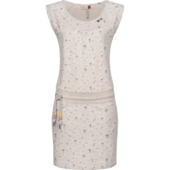 LOOK: Leichtes Baumwoll Sommerkleid mit angesagtem modischem All Over Print vom urbanen Trendlabel Ragwear, 100% vegane HerstellungMATERIAL: Leichtes Stretchkleid aus elastischem weichem Baumwollstoff und modischem Alloverprint, das Strandkleid ist super angenehm zu tragenPASSFORM: Super Länge bis ca. Mitte Oberschenkel, figurbetont durch das Kordelzugband, sportlich mit lässigem Understatement, passt sich toll der Silhouette anDETAILS: Minikleid mit hochwertigen Kunstlederlogopatches, seitlichem Taillenzugband mit dekorativen Holzperlen und stylischem Aufdruck Dieses Damen Druckkleid von Ragwear ist ein echter Allrounder für die warme Jahreszeit, ein super bequemes Shirtkleid mit viel Liebe zum Detail Leichtes Damen Baumwoll Kleid von RagwearSehr weiches, angenehm zu tragendes Sommerkleid aus 100% BaumwolleTop Qualität, hochwertige, vegane VerarbeitungDas Stretchkleid schmiegt sich wunderbar an den KörperKordel-Taillenzugband mit Logo geprägten Holzperlen (seitlich zum Binden)Sommerliches Allover PrintmusterAngedeutete Ärmel mit kleinem Krempelaufschlag2 seitliche EingriffstaschenLässiger RundhalsausschnittMit zahlreichen Logo-PatchesMaschinenwaschbar bei 30°C