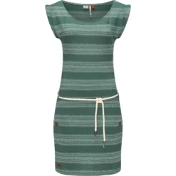LOOK: Leichtes Baumwoll Sommerkleid mit angesagtem Streifen-Muster vom urbanen Trendlabel Ragwear, 100% vegane HerstellungMATERIAL: Kurzarm Kleid aus leichtem und weichem Material, das für ein sehr angenehmes Tragegefühl sorgt, individuell einstellbar durch Kordel in der TaillePASSFORM: Stylisches Taillenband und lässige seitliche Eingriffstaschen mit Zier-Knopf in hochwertiger MetalloptikDETAILS: Einfach ein rundum gelungenes Printkleid, das sowohl lässig als auch schick kombiniert werden kann – ein echter Allrounder!Länge ca. halber Oberschenkel, der umschmeichelnde Schnitt setzt dabei die Weiblichkeit gekonnt in Szene, durch den Gürtel wird die Taille betontLeichtes Damen Jersey-Kleid von RagwearSehr weiches, angenehm zu tragendes DruckkleidTop Qualität, hochwertige, vegane VerarbeitungDas Sweat Shirt Kleid schmiegt sich wunderbar an den KörperVerspieltes modisches Taillenband zum BindenCooler Allover-Print mit kleinen Punkten (Eyecatcher)Bequemer RundhalsauschnittAngedeutete Ärmel mit kleinem KrempelaufschlagSeitliche Eingriffstaschen mit Zier-KnöpfenMit zahlreichen hochwertigen Logo-PatchesMaschinenwaschbar bei 30°C