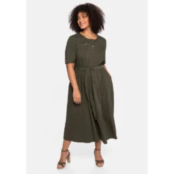 Dieses tragekomfortable Kleid von sheego ist leicht ausgestellt geschnitten und besitzt eine wadenumspielende Midilänge. An den Rundhalsausschnitt schließt sich eine Knopfleiste an, die Taille rückt durch den gekräuselten Gummibund sowie den breiten Bindegürtel in den Fokus. Eine Brusttasche mit Knopf und Blende gibt dem Kleid seinen sportiven Look, dazu sind die Ärmel, die mit Riegel und Knopf abschließen, eine gelungene Ergänzung.