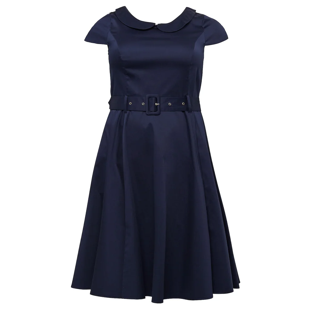 Kleid mit Bubi-Kragen und weit ausgestelltem Rockteil von sheego by Joe Browns. Kurze Flügelärmel und ein Stoffgürtel runden den charmanten Look ab. Durch den nahtfeinen Reißverschluss im Rücken wird das Ankleiden einfach. Die Passform ist figurumspielend. In leicht elastischer Qualität.