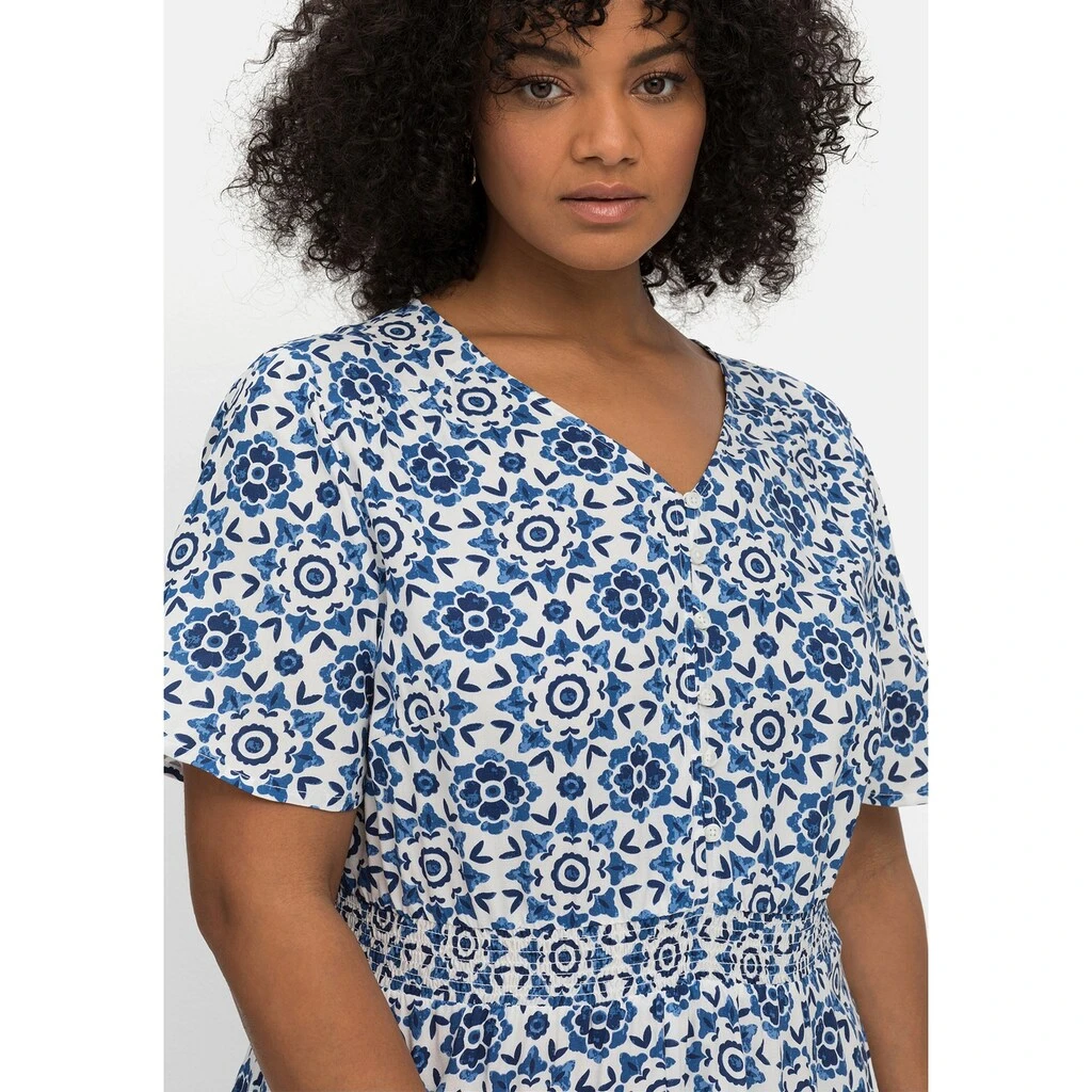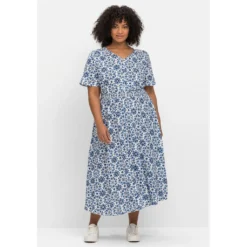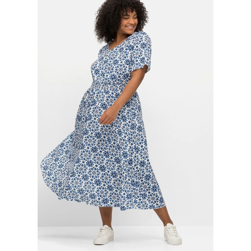 Das Kleid von sheego by Joe Browns begeistert mit seinem sommerlichen Print und der weich fließenden Qualität. Das knöchellange Kleid ist mit einem femininen V-Ausschnitt gearbeitet, der in eine kurze Knopfleiste übergeht. Durch die leicht gekräuselte Rückenpasse erhält das Kleid einen optimalen Sitz. Die Taille wird durch den gesmokten, leicht angekräuselten Gummizug geschickt betont. Daran schließt sich ein ausgestelltes, weit schwingendes Rockteil an.