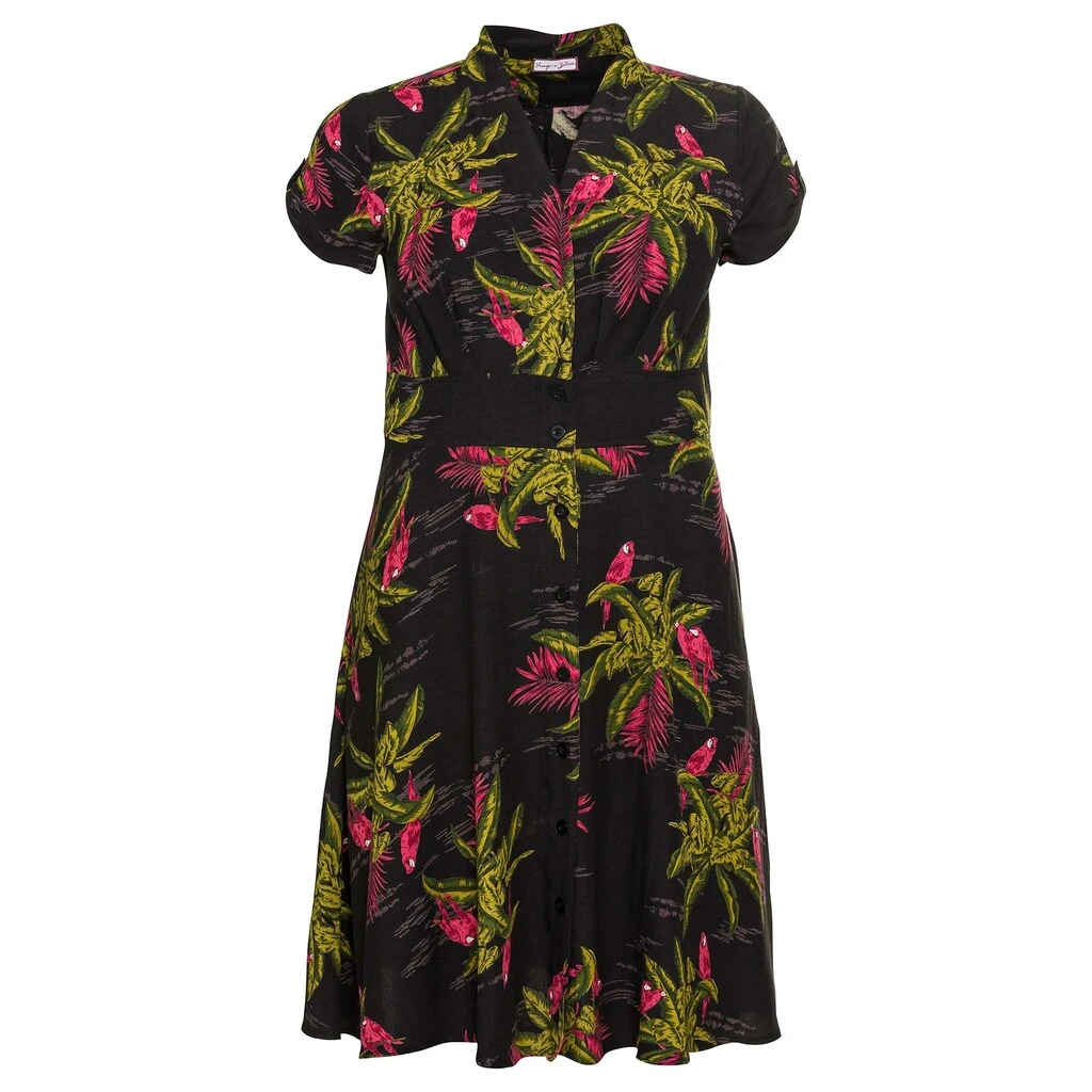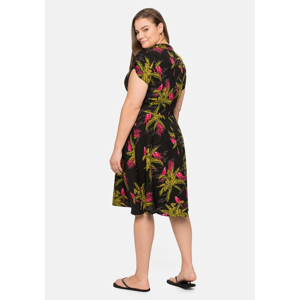 Das Kleid von sheego by Joe Browns erhält seinen besonderen Charme durch den Papageien-Alloverdruck. Am streckenden V-Ausschnitt befinden sich Druckknöpfe, die kurzen Ärmel lassen sich unkompliziert krempeln. Ein breites Taillenband mit gelegten Falten betont die Körpermitte, darunter schließt sich der weit schwingende, knielange Rock an.