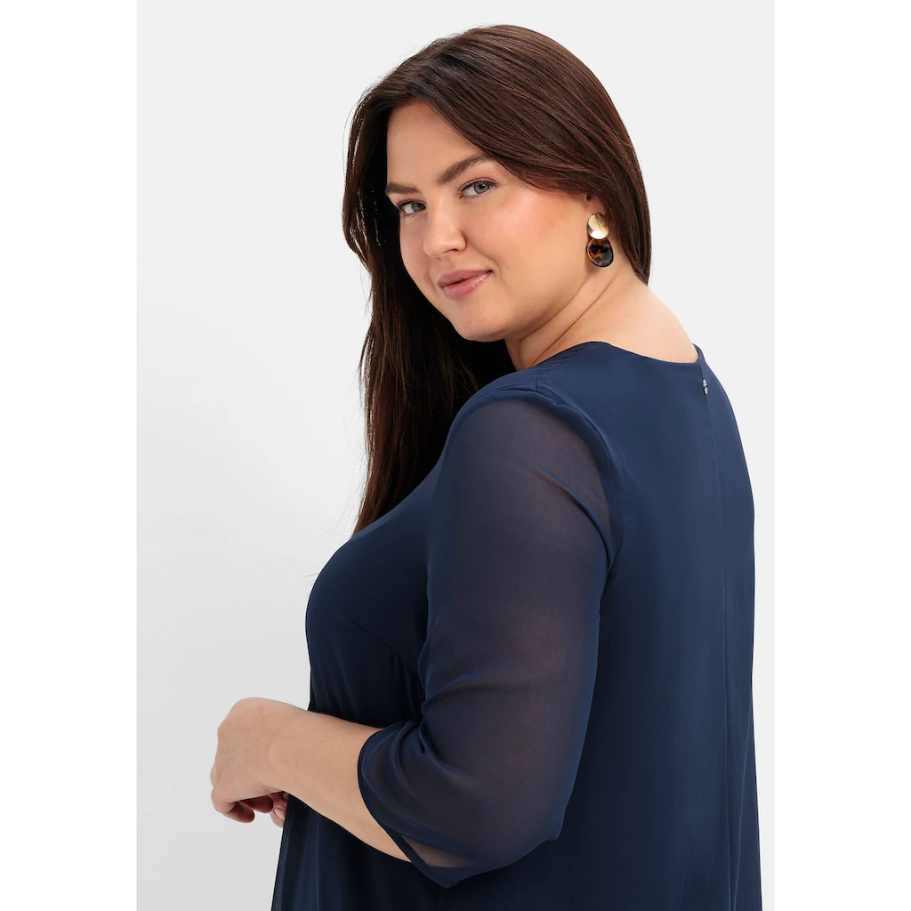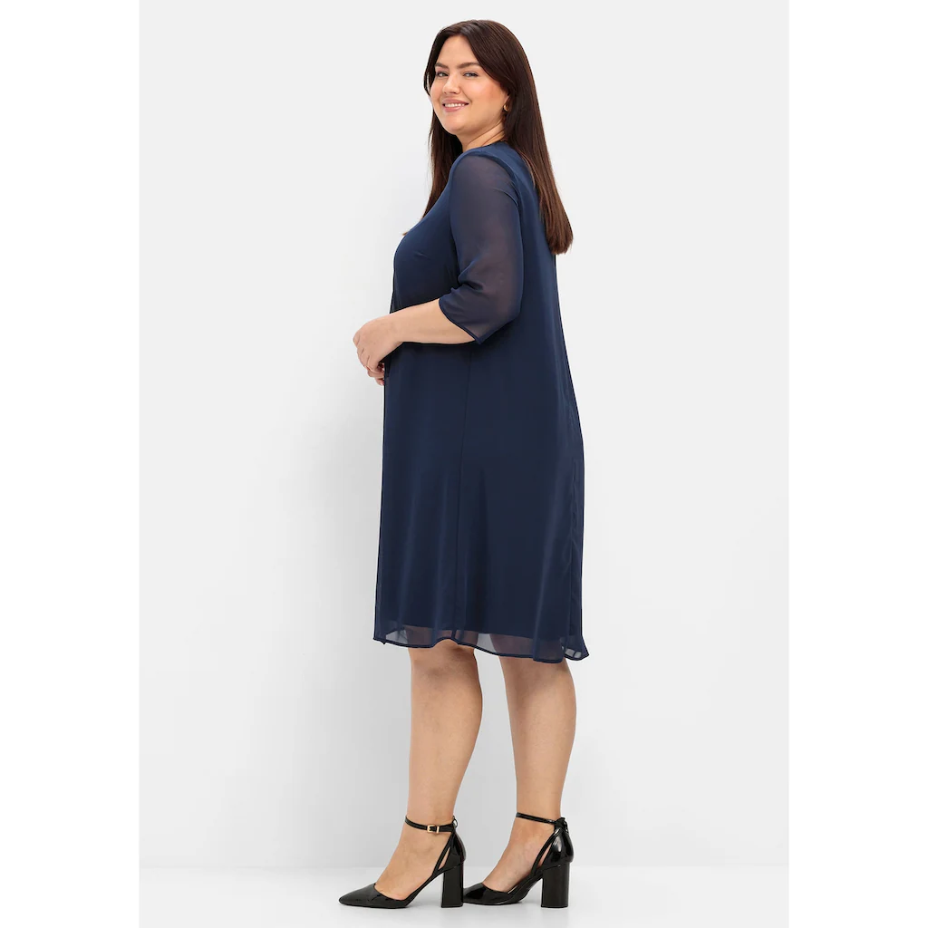 In eleganter Layeroptik zeigt sich das Kleid von sheego. Der doppelt gearbeitete Style ist nur an den 3/4-langen Ärmeln transparent, die untere Lage aus elastischer Qualität ist absolut blickdicht. Die dekorative Kellerfalte zusammen mit dem leicht ausgestellten Schnitt lassen das Kleid locker schwingen. Durch die mittlere Teilungsnaht hinten wird die Silhouette optisch gestreckt.