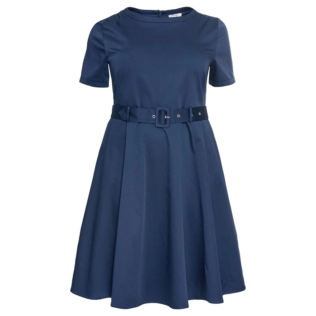 Feminin, elegant und zeitlos präsentiert sich das knielange sheego Kleid in leicht glänzender Qualität. Am Oberkörper ist es sehr schlicht mit Rundhalsausschnitt und kurzen Ärmeln gearbeitet. Der Gürtel legt den Fokus auf die Taille, darunter schließt sich ein weit schwingender Rock an. In die Seiten sind Taschen eingefasst, ein nahtfeiner Reißverschluss befindet sich hinten.