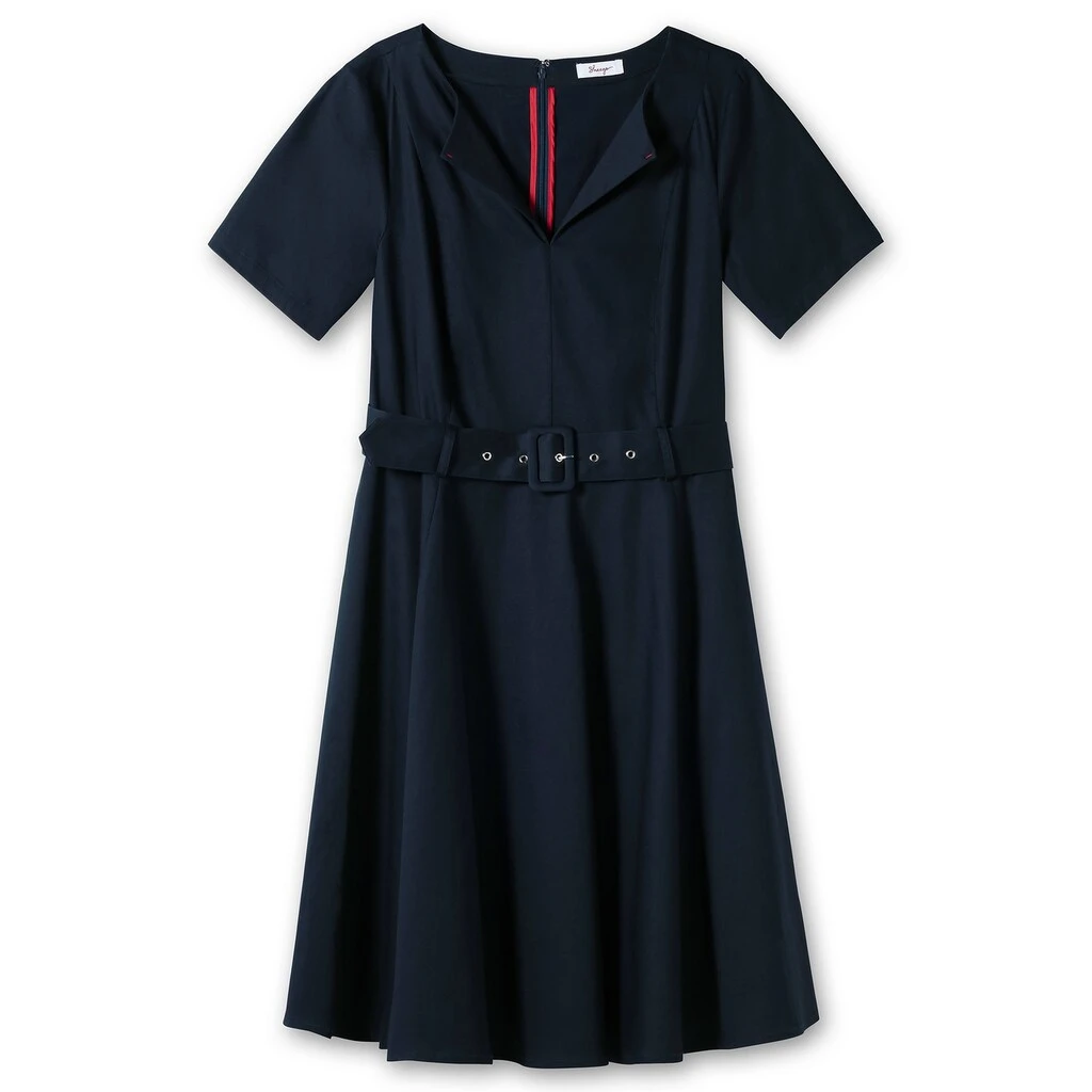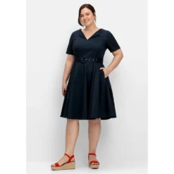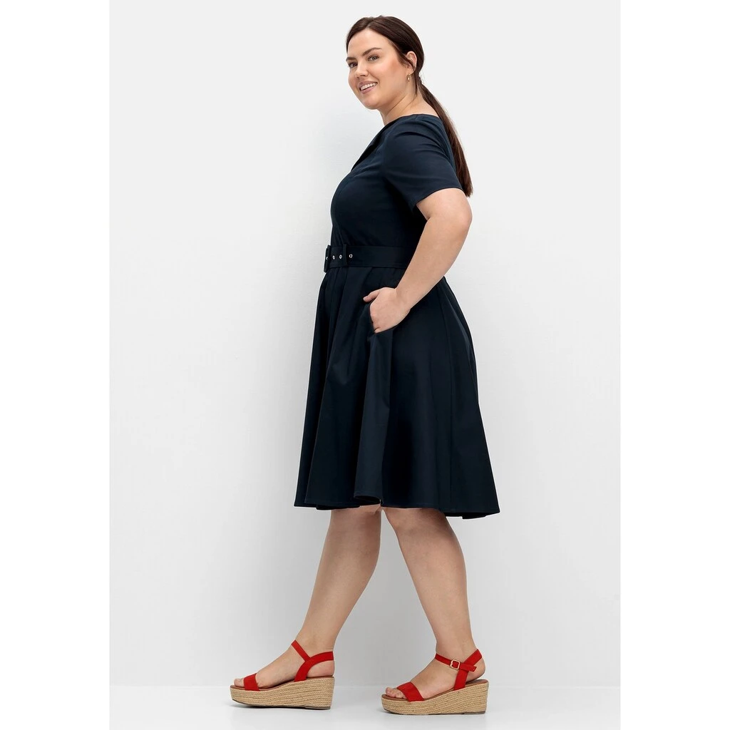 Dieses angenehm elastische Kleid von sheego erhält durch die dezent glänzende Oberfläche eine elegante Note. Der Rundhals mit Reverskragen lässt einen femininen V-Ausschnitt entstehen, Teilungsnähte am Oberkörper sorgen für eine optimale Passform. Dank des nahtfeinen Reißverschlusses im Rücken fällt das Ankleiden angenehm leicht. Der weit ausgestellte Rock in knieumspielender Länge zaubert eine feminine Silhouette und schwingt mit jedem Schritt schön mit. Dabei wird die Taille durch den Textilgürtel mit stoffbezogener Schnalle charmant betont. Zwei seitliche Nahttaschen runden den Style praktisch ab.