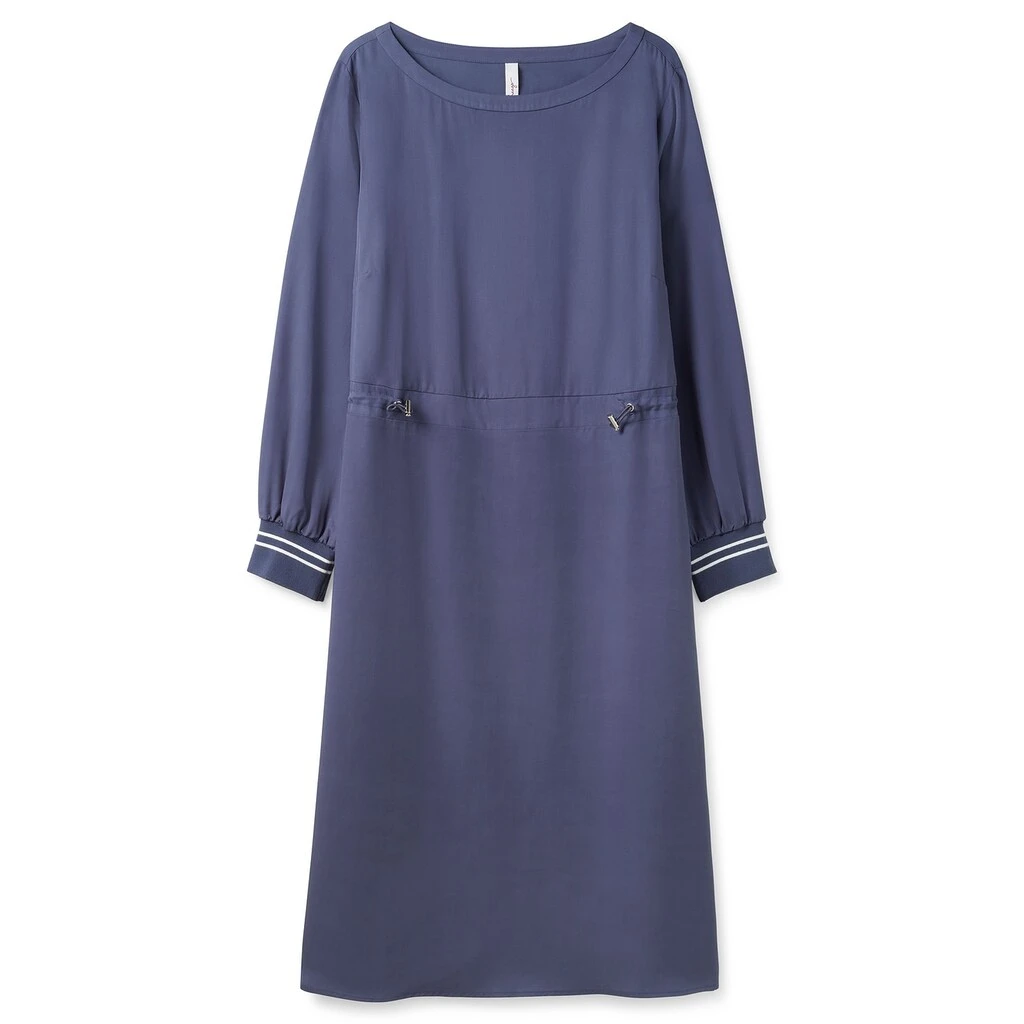 Die herrlich leichte, atmungsaktive Qualität dieses sheego Kleids ist weich im Griff und begeistert mit fließendem Fall. Lässig und unkompliziert präsentiert sich der Schnitt, der durch den Tunnelzug sowie die geringelten Rippbündchen am Ärmel sportiv geprägt wird. Mit der regulierbaren Gummizugkordel kann die Taille individuell betont werden. Ein eingefasster, hoch angesetzter Rundhalsausschnitt ergänzt diesen entspannten Look.