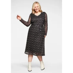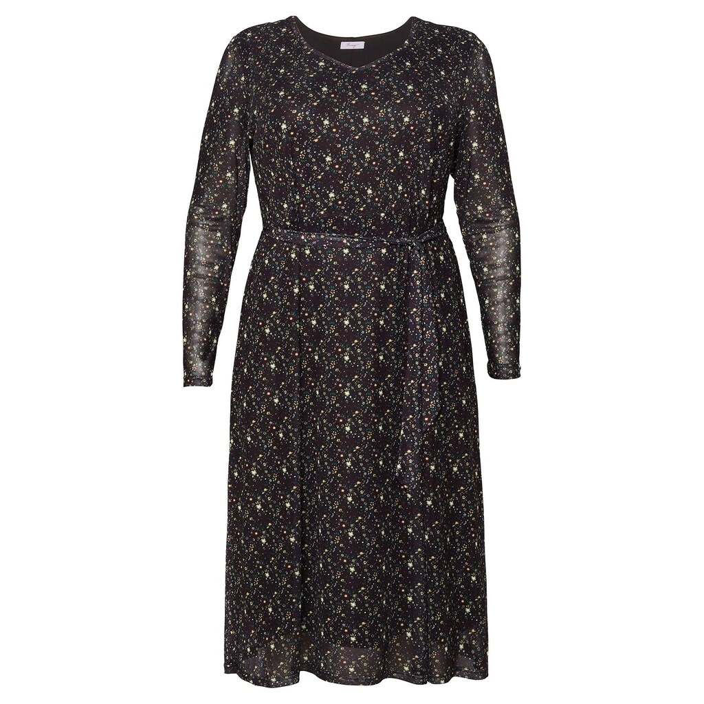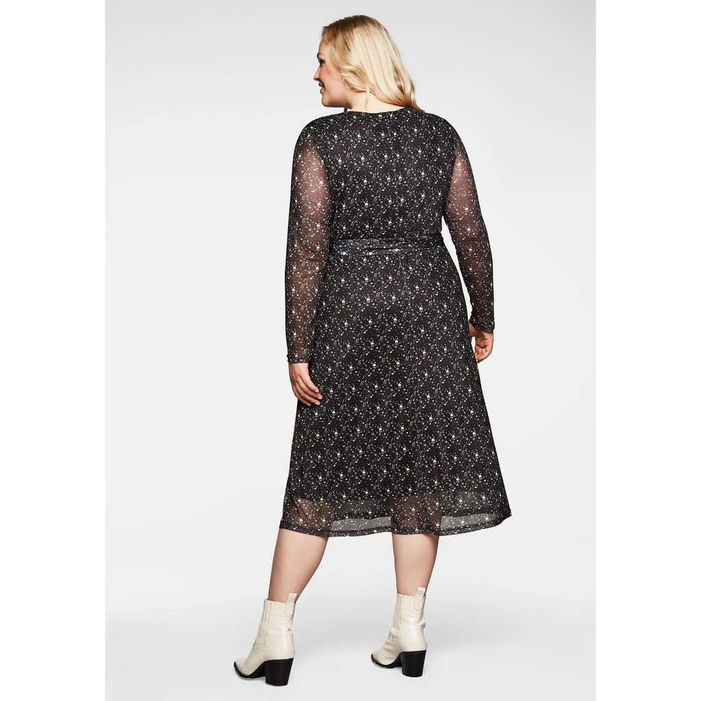 Die zarte Mesh-Qualität und der feminine Millefleurs-Druck machen dieses sheego Midikleid besonders dekorativ. Es ist mit einem V-Ausschnitt gearbeitet, ein Bindegürtel setzt die Taille in den Fokus. Die langen Ärmel sind etwas weiter geschnitten und tragen sich so sehr komfortabel. Das Kleid besitzt eine wadenbedeckende Länge und wird durch das Futter aus pflegeleichter Jerseyware am Body blickdicht.
