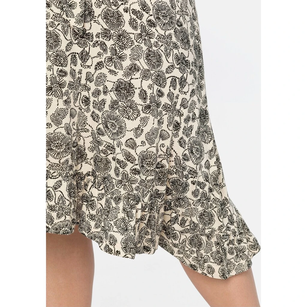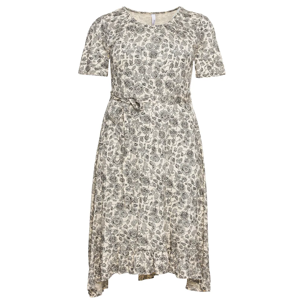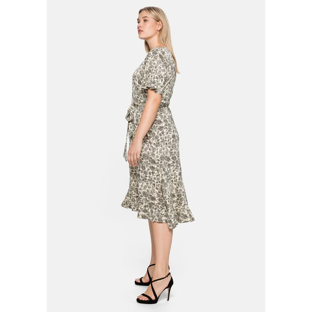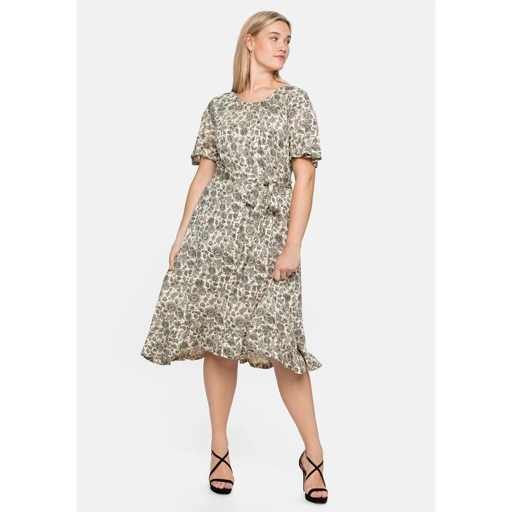Dieses sheego Kleid wird dank der kurzen Flügelärmel und des floralen Alloverdrucks zum femininen Hingucker. Die zarte Kräuselung am Rundhalsausschnitt und das Bindeband in der Taille ergänzen den sommerlichen Look. Für Leichtigkeit und Schwung sorgt der dekorative Saum, der wunderschön mit Volants gearbeitet ist. Dazu kommen der luftige Schnitt und das leichte, weich fließende Material.