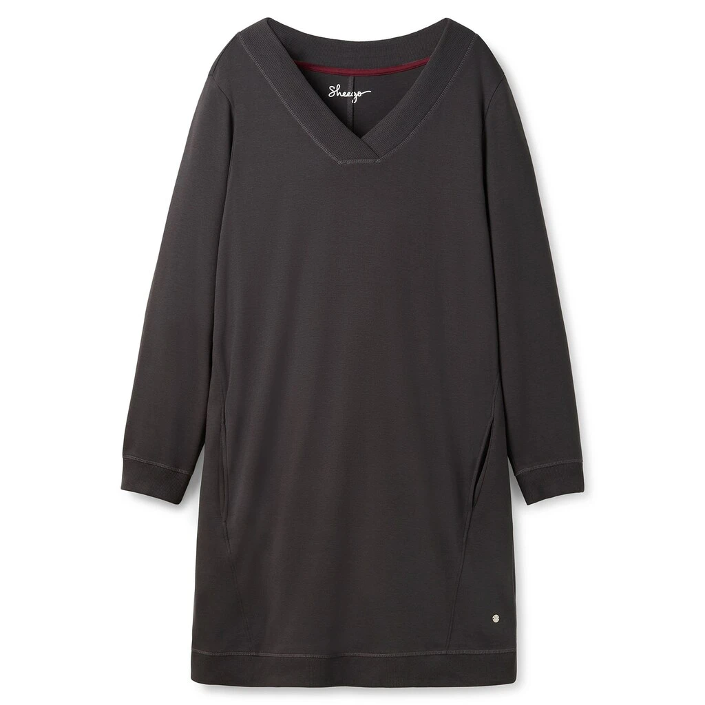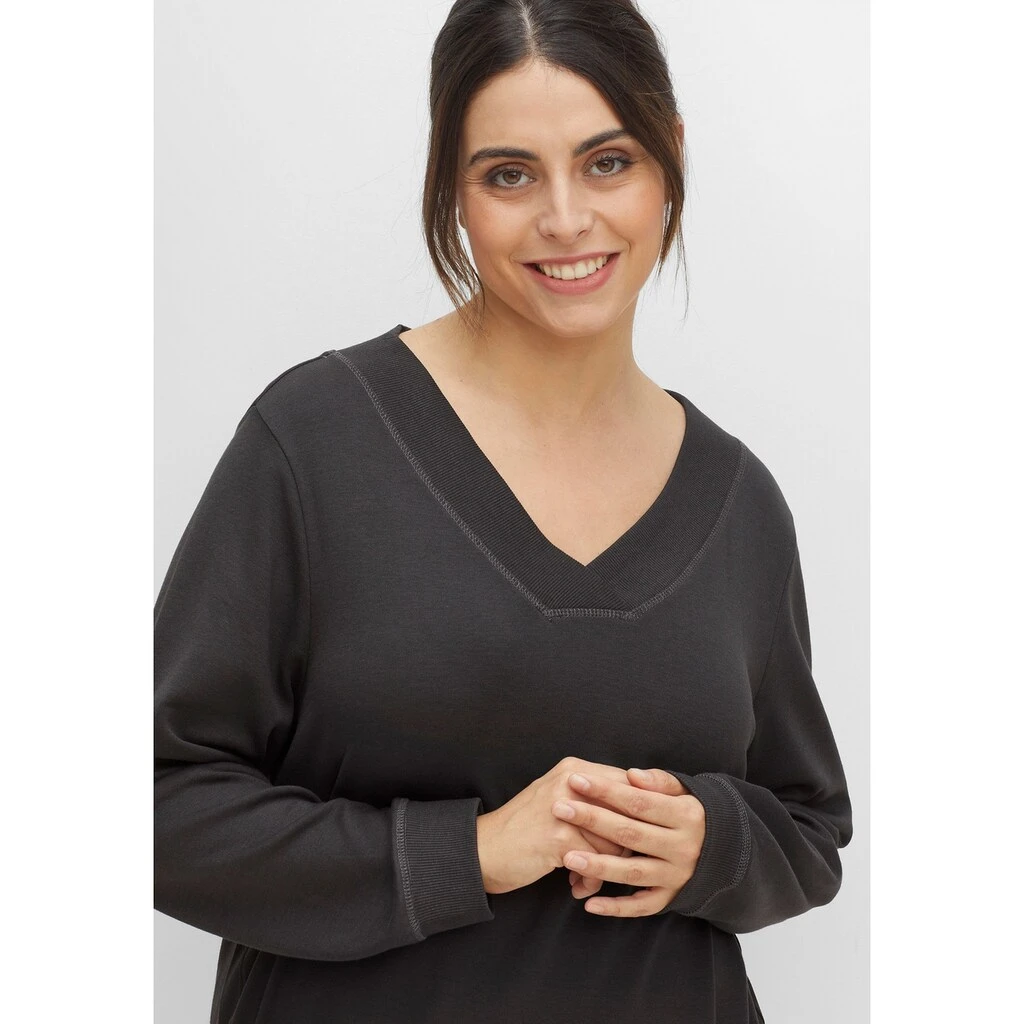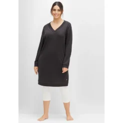 Das Relax-Sweatkleid von sheego erhält durch den tiefen, gerippten V-Ausschnitt eine feminine Note. Sportiv wirken die praktischen Eingrifftaschen in der vorverlegten Seitennaht sowie die Rippbündchen an Ärmel und Saum. Der legere Schnitt sitzt angenehm locker und endet in knieumspielender Länge. Der weiche, elastische Interlock zeichnet sich durch seine Formstabilität und Strapazierfähigkeit aus. Eine zusätzlich eingearbeitete Anti-Pilling-Ausrüstung verhindert die Fussel- und Knötchenbildung – so bleibt das Loungekleid länger schön.