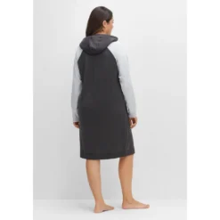Lässig im Look, bequem im Tragegefühl: Das Sweatkleid von sheego kreiert durch Kapuze und Bindeband, Kängurutasche sowie den farblich abgesetzten Raglanärmeln einen lässig-sportiven Streetwear-Style. Rippbündchen am Langarm und am Saum bringen Bequemlichkeit. Das knieumspielende Kleid trägt sich sehr angenehm dank seiner weichen, formstabilen Interlockqualität mit hohem Naturfaseranteil. Die Anti-Pilling-Ausrüstung verhindert Knötchen- und Fusselbildung – so bleibt das Relaxkleid noch länger schön.