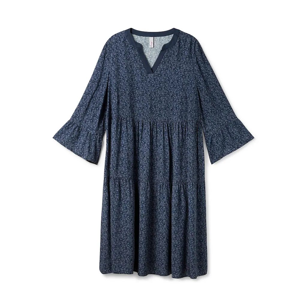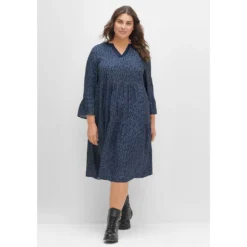 Das weich fließende Hängerchen-Kleid von sheego ist mit einem zarten Alloverprint versehen. Die ausgestellte A-Linie erhält durch die angekräuselte Teilungsnaht unterhalb der Brust femininen Schwung. Die 3/4-langen Trompetenärmel und ein Rundhalsausschnitt mit Schlitz und Blende runden den Look des Kleids perfekt ab.